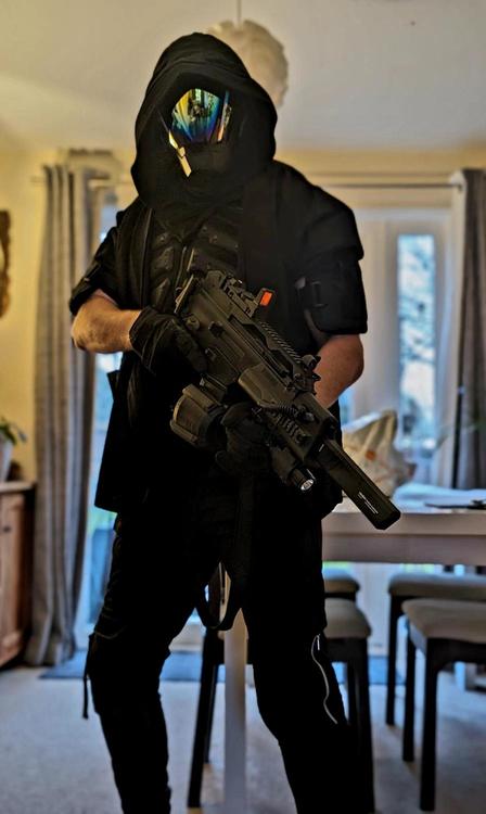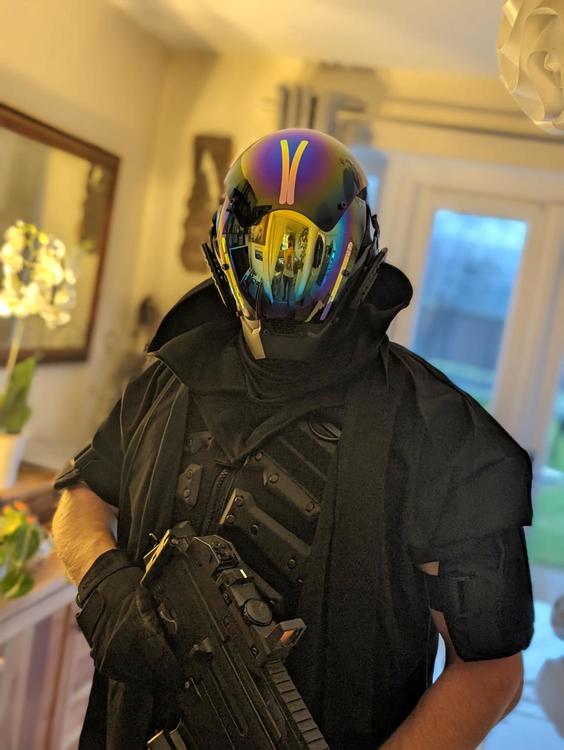 (Re-posted as I put it in the wrong place previously) WIP experiment in 'cyber ninja' loadout. Pretty sure the mask won't hold up to a heavy hit, so I've got eye pro underneath (and replacement panels are dirt cheap). Got some tabi boots on the way and I'll probably use the swords from my Deadpool set-up to finish the look. Emphasis is purely on mobility. It's refreshingly lightweight and agile, and should bring a few smiles.?1 point -