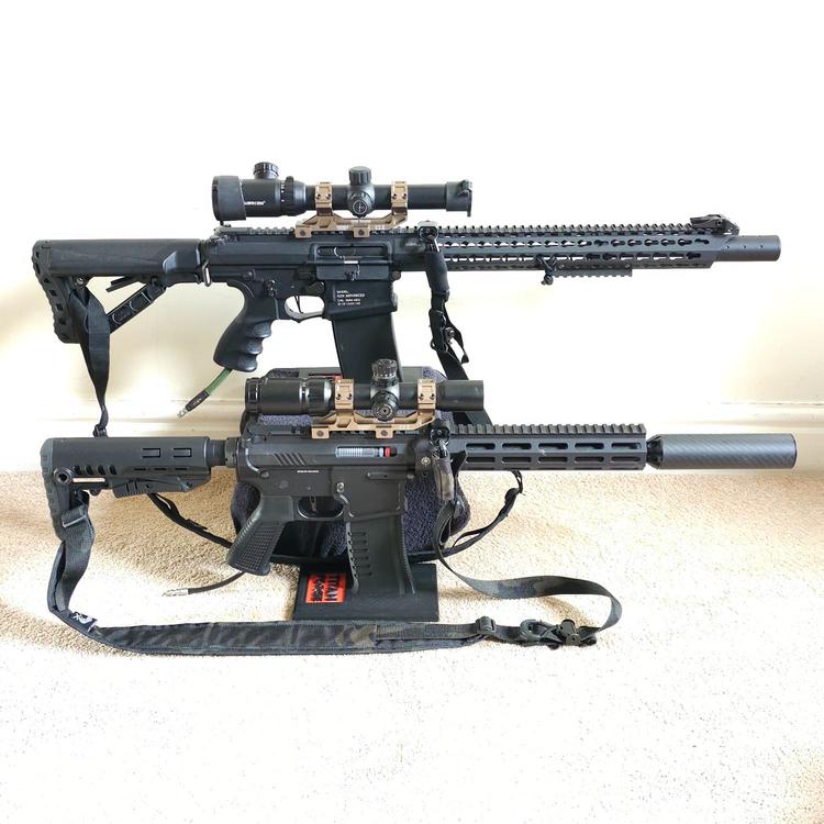 As a lot of threads end up with one of us recommending the Tokyo Marui MWS, and i get PM's asking about it, i figured I'd start a thread to keep all of the information in one place. Here i plan on covering a general overview of the gun, as well as upgrade parts, general maintenance and tuning. If anyone else wants to share any information, guides or even gameplay with their MWS, here is the place to do it. With that being said, lets get on with it. I've had my 2 Tm m4 GBBR's for a little over a year now, and they've got through dozens of changes to get them where they are today. Out of the box they are beautifully finished and boast impressive performance. I bought my first one from Zeroone, who price matched it for me. At the time the gun set me back £430 and the magazines £35, but they have risen quite a bit in price in most places. The gun is incredibly well finished and sports a Cerakoted receiver. Before opening the box, i didn't get what the big deal was about Cerakote, but that all changed after using it over time. The finish is VERY resistant to the hard life I've shown it, and is far more scratch resistant than any paint or anodization on any other gun I've owned. The two I have still don't have a scratch on them. At the rear is a standard m4 stock, which does its job with little wobble, but isn't the nicest one I've ever seen. The railed handguard is very solid and nicely finished with all of the correct numbered markings on the rails. From there you have your usual front triangle iron sight which DOES NOT have a sling attachment at the base. The magazines hold 35 BB's and have a Cerakoted shell to keep them from scratching easily. They have very recently started coming with silent fill valves, but are mostly the normal kind that hiss when filling and spray liquid propane when full. Its worth noting that the valve sits at an angle to the baseplate. One modification i would highly recommend to do is the "green gas mod" which involves removing a long zinc tube from inside the magazine. This allows more gas into the magazine and upping your shots per gas fill dramatically, with some people reporting 150+ shots from a single gas charge. As a side note, i have started to just cut the zinc tube about 1 inch from the base instead of removing it entirely. A video showing how to do it: Chronograph Results: using blaster .20 BB's and green gas i got around 298 fps with a deviation of 2FPS. yes, you heard that right, " FPS. This thing is incredibly consistent! Important information: The inner barrel is 250mm on the 10.5 " CQBR and the 14.5" carbine, meaning on the 14.5" outer you can fit a much longer 370mm inner barrel. The Hop up adjustment dial is similar to Tm pistols and can be located inside the upper receiver by locking the bolt back and looking down the magwell. Due to the way the outer barrel is cut, it's not possible to fit an aftermarket rail onto the gun without one of two things. A barrel adapter ring (PTS, ORGA and a couple of others make them and usually cost £10) or A dytac outer barrel, which has a wider lip, as shown below. Dytac on the left First shots: I took it down to the 20m range at the First and only shop and loaded it up with .28 blaster devils. They had multiple targets there, but i focused on the little spinning targets at the back wall. The orange discs must have been no more than 1.5 inches in diameter and i was hitting it virtually every time with the iron sights. So far, very impressed with the accuracy. So much so, I treated it to a new dress! First internal upgrades: After speaking with Dave about the gun, he explained that the gun wouldnt hop really heavy weight BB's with the standard nub. because it was hollow and squished when applying hop pressure. To remedy this he machined me a great little nub out of brass. Isn't it beautiful!? This meant i could now lift much heavier BB's increasing my range and accuracy even further than the already impressive stock performance. Using this new nub and GEOFF .32 bb''s i was able to get the bb's out 60+M with a flat trajectory. They were making a 1.5-2ft grouping on the plastic bales as seen in the video below. I have SOOO much move to cover, including barrel reviews, customs mods and a DMR build, but its 5;30 am and i need to be up in an hour, so we'll continue this tomorrow1 point -