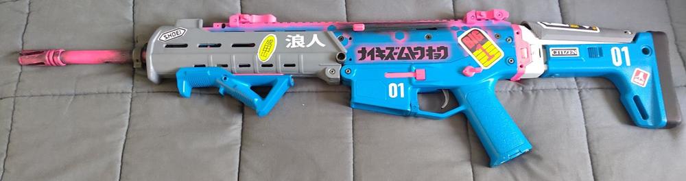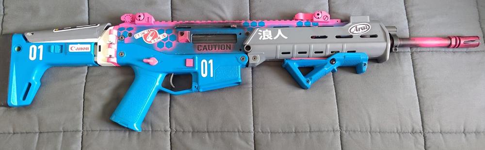 So, I haven't shared this yet despite having it sat around for a few months. For context this was a boneyard A&K Masada/ACR. When I got it, the exterior of the rifle was scuffed, chipped and dented beyond belief and the previous owner had even super glued rails to the handguard. Instead of fixing the ambi fire selector properly, they had also super glued the fire selector on which I've since fixed. Since it was already destroyed externally I decided to go the absolute opposite way of what I normally go for, so I went with the brightest colours I could think of. Is it cursed? I think I actually prefer it to the standard look of most of my RIFs.1 point