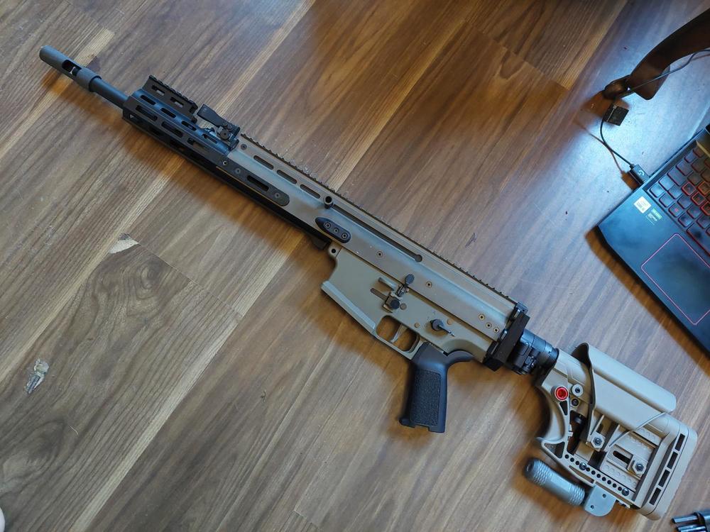 New 'inexpensive' DMR build. Base gun is a polymer GE 417, for weight and low price. Out of the box it was pretty horrid , but tbf for what it cost I wasn't expecting much. Gearbox is a long V2 with a mosfet and some sort of electronic full auto set up, no COL and a micro switch whitch enables full auto. I'm not realy a fan of mosfets as I see it as adding unnecisary electronic crap, ( and I'm normally running GBBR) but I'll concede that the lack of COL is handy in a semi locked pew. I've replaced the piston head and added a slightly longer double o ring nozzle, compression is now awesome. Switched to a ZCI rotary hop and inner barrel, along with a M/L rubber and Omega nub. Also a high torque motor. Now running at 1.78j on my home chrono on .36BBs. Quick blow over with Halfords paint to make it look a bit less plastic and added a few spare decals I had. It'll get a run out next game to shake it down, but happy with that.1 point