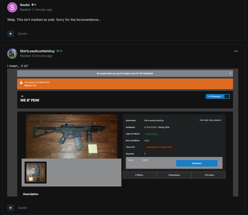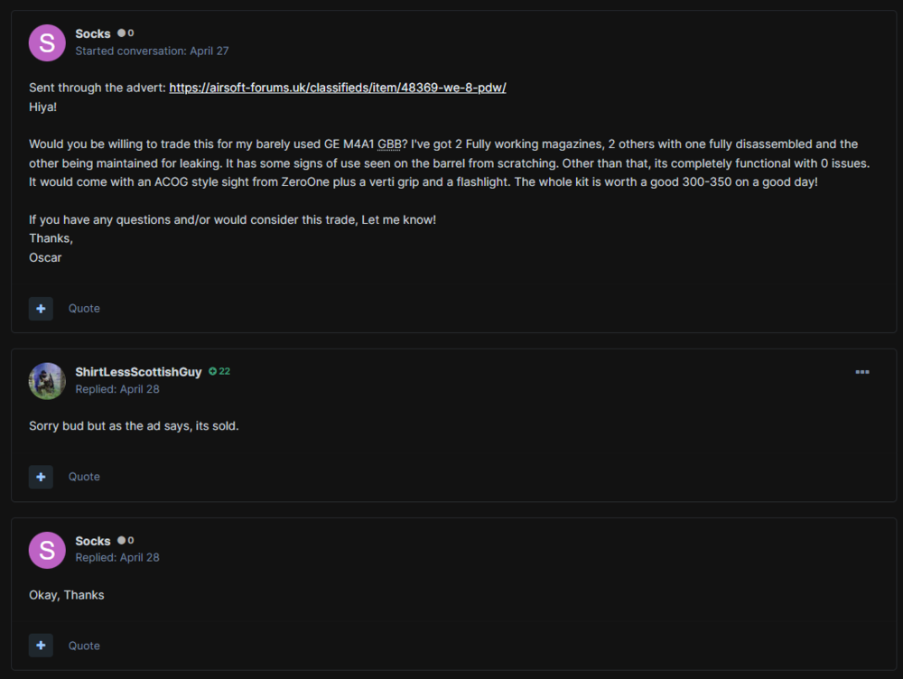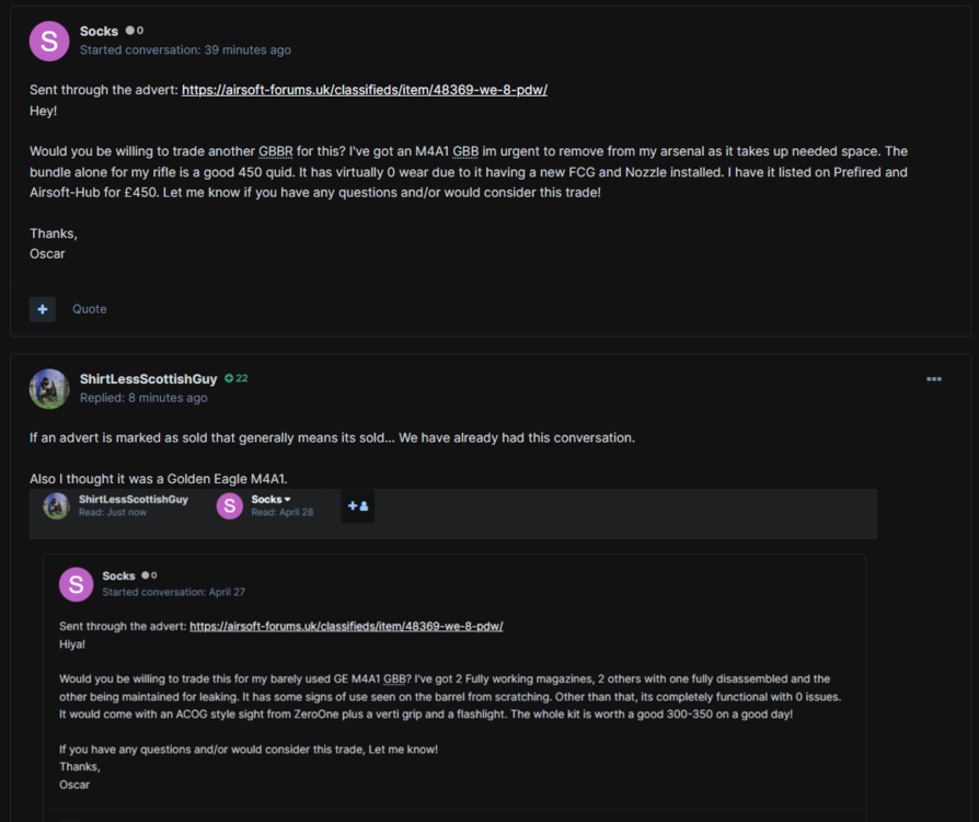 This user a little over a week ago tried offering me his "GE M4A1" worth "£350" for my marked as sold WE PDW but I explained I not only had sold and marked as such the PDW I didnt want a GE. Now 10 days later he has messaged me again on the same advert marked as sold offering me a "WE M4A1" worth "£450". So just be careful I have reported this but I get a feeling he is just casting lines hoping to get a catch. And then today...1 point -