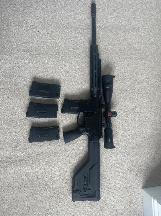 Custom DMR based on RSASS -3D printed handguard from Falcon Airsoft - Krytac Trident receiver -ICS DMR stock - generic scope Internals - maple leaf 410mm barrel -ZCI rotary hop - 70 maple leaf mr hop - m130 spring - 18:1 gears - Perun hybrid v2 - Perun clicker mod Firing around 390 on .3 grams and only used once. Just wondering it’s worth as I may go back to GBB. Could include 4 short epm magazines1 point