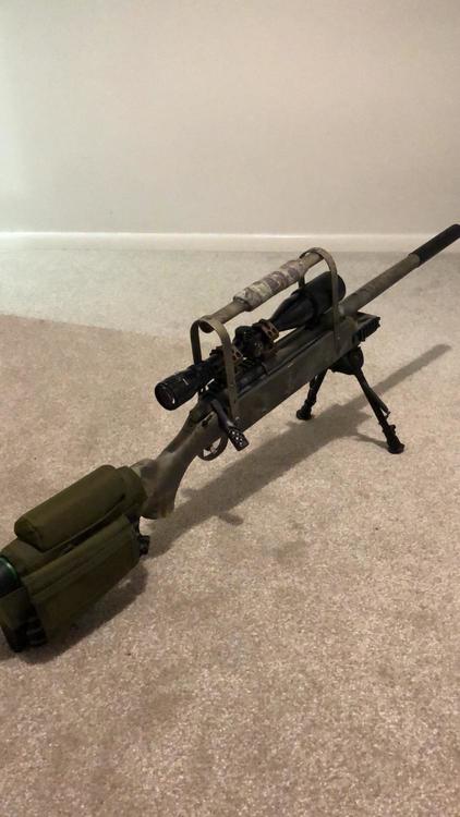 Why the hell does an AEG with a specifically designed longer gearbox made for more air volume for long barreled DMR builds come with a goddamn ported cylinder out of the box? Had a local tech fit a full cylinder, as well as a Perun mosfet in place of the cheap Cyma platinum one, programmed for semi-auto only and then had some electrical tape put over the full-auto sensor as well so it's doubly semi-locked! Also no pre-cocking because it's incredibly snappy on semi-auto anyway with an 11.1v lipo (ASG Infinity U-18000 high torque motor + Lonex helical gears) and I'd rather not risk extra wear on the parts and doubly not risk me accidentally leaving it cocked after a game day and killing the gearbox parts. Now comes my part. I've got a load of springs to go through as I want to find one that will do 1.14J on a .32 and another that does 1.88J on a .43. I think the current hop setup will handle it, but if not I'll need to experiment there as well. Thankfully, the hop and barrel assembly is a piece of cake to take out and it has a quick change spring system; I'd never do an AEG DMR build without a quick change spring. It's a bit of a heavy beast now with the massive 3.5-25x56mm scope (the eye relief on it is perfect for me on this) and the bipod and MAWL on the front, but I love how it has turned out!1 point -