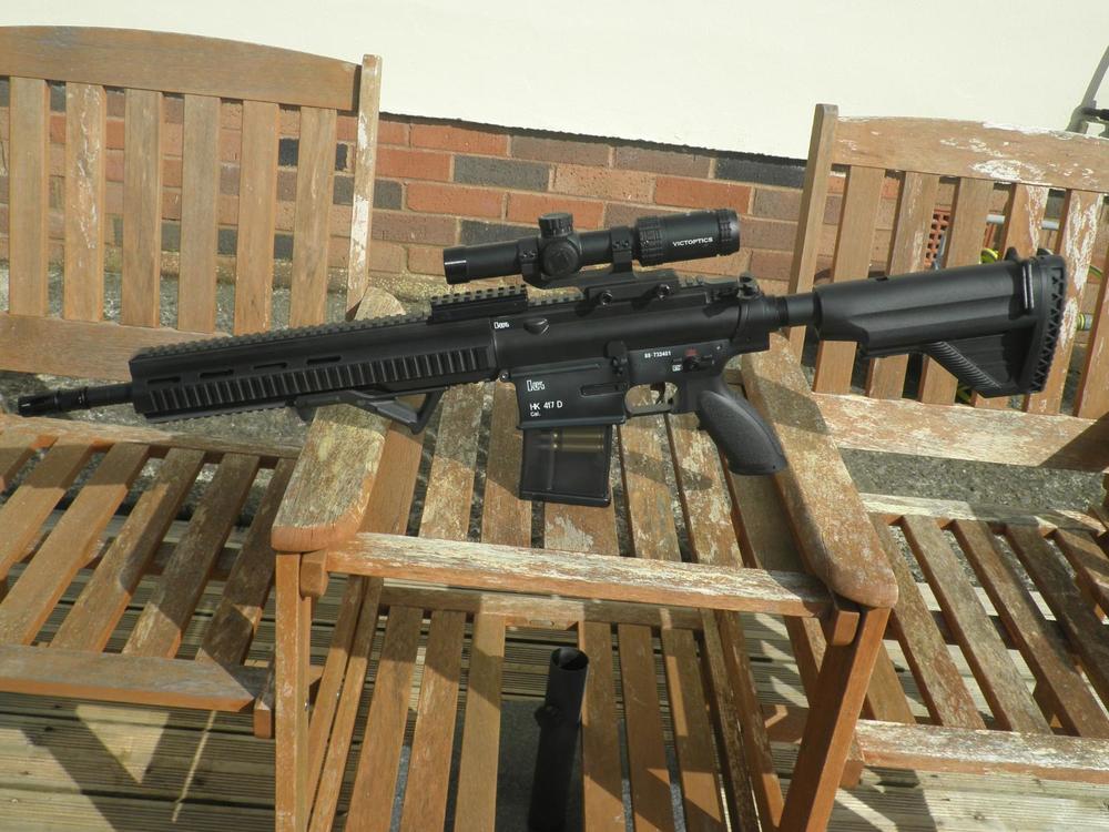 New 'inexpensive' DMR build. Base gun is a polymer GE 417, for weight and low price. Out of the box it was pretty horrid , but tbf for what it cost I wasn't expecting much. Gearbox is a long V2 with a mosfet and some sort of electronic full auto set up, no COL and a micro switch whitch enables full auto. I'm not realy a fan of mosfets as I see it as adding unnecisary electronic crap, ( and I'm normally running GBBR) but I'll concede that the lack of COL is handy in a semi locked pew. I've replaced the piston head and added a slightly longer double o ring nozzle, compression is now awesome. Switched to a ZCI rotary hop and inner barrel, along with a M/L rubber and Omega nub. Also a high torque motor. Now running at 1.78j on my home chrono on .36BBs. Quick blow over with Halfords paint to make it look a bit less plastic and added a few spare decals I had. It'll get a run out next game to shake it down, but happy with that.1 point