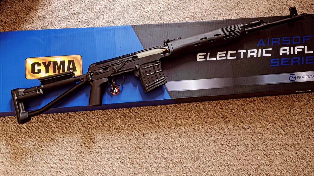 Oh myyy......? I haven't been following this, but I'm gonna go back and find details! Anyway... This isn't that exciting when it comes to gun pictures, but I'm a happy boy and had to share. Last year I gave a friend my cheapy Cyma SVD, for servicing and upgrading. Then life got in the way. I got a rotator cuff injury, he lost his driving licence (illness, not booze), and what with one thing and another he's had it ever since. On Sunday I got it back. Full steel rack piston, 110 spring, different piston head, new hop rubber, hop nub, new set of bushings for the gears, combat union hop. Its kicking .3s out around 1.4 to 1.5 joules. I'm on site tomorrow, to continue with our site overhaul, and I'll be giving her a real test for range. Now all I need is an SVD sling.1 point -