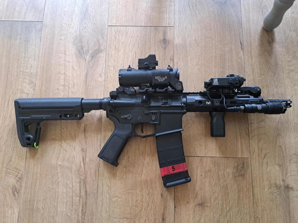 Did a bit of a revamp of my 10" M4.... It's now a 5" M4. Used a spare Specna upper receiver I had, got a new 5" carbon fibre barrel, moved the ARP-9 handguard from my AAP carbine, cut down and recrowned an old Guarder 363x6.02 barrel, replaced the cylinder (from 4/5 hole to 2/3), random spring (m100? m110? who knows) and now I have a very smol boi. Why? Because I want lightweight and compact for long tournaments, this horrid thing is very consistent in Joule output and spread (very surprising given the silly short barrel), plus I'll be strapping a thermal scope onto it at night, the more weight I can shave the better. Powered by a funny 7,4v 1800mAh 130/65c battery that gets me in the 25 RPS region (by sound, need to confirm via chrono). As always, functionality over aesthetics. P.S. G43 + FTC is on there just for show, I don't really use it.4 points -