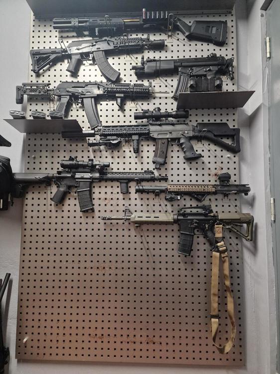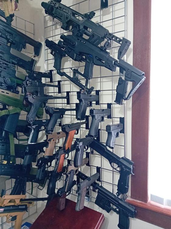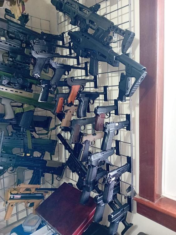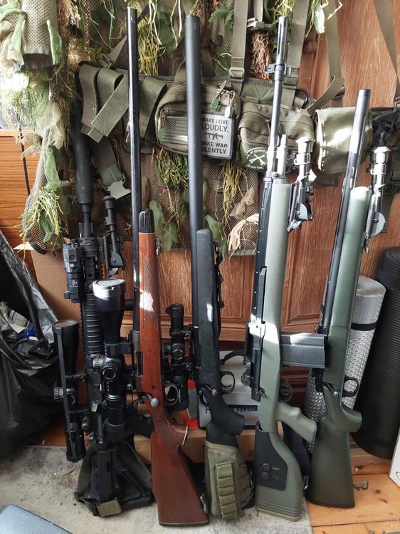 The remaining guns that need testing and tweaking while I'm not allowed to play. Most are simple tests and tweaking, nothing major since I finally got the MWS hopping the ammo I want to put through it last Sunday. It's mostly just setting the hop for the weights I want to use, but a few other minor tweaks needed. From left to right: TM MWS w/ Modelworks mk12 kit - Need to make sure it's shooting straight. Scope I had on it was wonky because of the mounts on Sunday Tanaka m700 w/ real Remington stock - Installed a new hop rubber and nub as it was a bit crap before. Need to set the hop now with the new setup JG BAR-10 - Just need to find what psi to set for 1.1J so I can use it at night games / no MED games; disgustingly quiet since it's internally suppressed and half of that outer barrel is just alternating large/small foam baffles. Already know it shoots phenomenally at 155psi, which gives about 2.3J on .48s, and I can go as low as 80psi, so sure I can get it to 1.1J as well G&P m14 DMR - Ironically not a DMR. Wasn't hopping well, but power, noise and snappiness was all amazing, so installed a new MR hop rubber. Need to set the hop up now. KJW m700 - Usually has a suppressor on it! Finally got around to finishing this one with the threaded shorter outer barrel, as well as the AA hop unit, nub and flamingo rubber. Need to set it up, both power and hop up. I think I have a type... ?1 point
