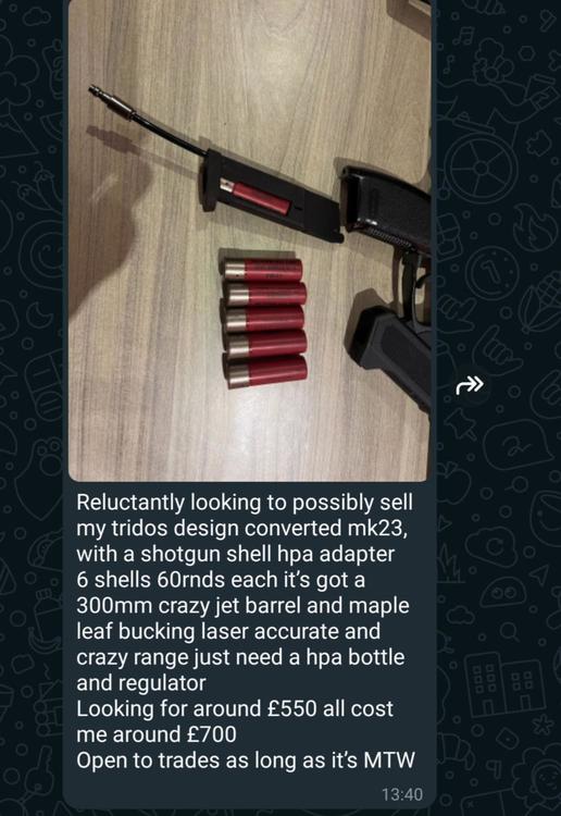 I have to think that this belongs here. I want to know how exactly it gets to this price, doesn't mention the base MK23 it's built off (probably a cheap ASG?) The shell adapter is about £100 new so where's the rest of the cost, and why is there only one photo that doesn't even show the entire thing? ?1 point