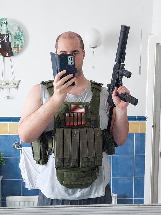 I don't have any shots of it in game because it's not my preferred way of playing and I'm not playing for 2 more months because of heart surgery last week so I won't get any new pics any time soon, so have a crappy bathroom mirror pic: And as I said, I only have this one plate carrier for everything. If I want to use my MWSs, AKM or multitude of .308 guns, all I need to do is swap out that front panel for one of the other two. They just clip in and velcro on and takes a matter of seconds to swap over:1 point