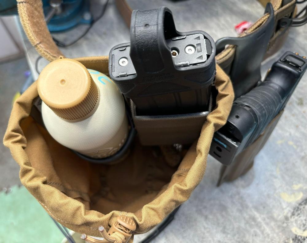 Small alteration to my Direct Action Gear dump pouch. I already had the Esstac Kywi in it but I added a molle popper to keep the 3rd column of molle against the belt and hold it open better. Then I added some elastic cord and cordlock to allow a can of gas to be stowed in there too. The cordlock is ziptied to the back of the pouch so I can grab the knotted end and pull it tight one handed.1 point