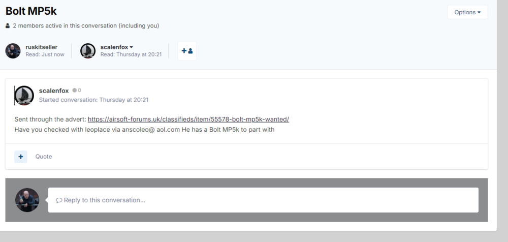 User Larryoutf is clearly a scammer. He messages people's wanted adverts with the email for his "friend" who has the item. It is the same generic message, regardless of item and is a proven, tried and tested method seen across many forums, not just airsoft. How do we report these accounts and protect genuine forum members?1 point -