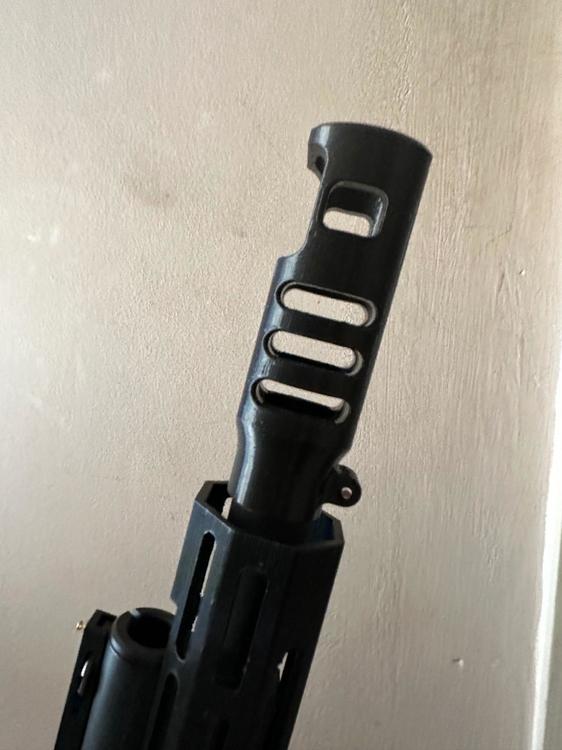 Hello Hello, I remembered I had an account here and asked some questions some time ago related to these projects. I figured I'd do a bit of a project dump on what I've been up to. I'll use this thread for future additions, as I certainly have more planned as funds allow. The BR-55 and M7 SMG are near completion and are fully functional. Both need a few tweaks and some internal parts. I'd stopped both projects until January this year, and started both from scratch with the aid of my new printer, a Prusa XL (single head for now). Due to ill health, I had to stop work on the BR, having completed a lot of but not all of the physical aspects, and instead directed my attention to the design work for the M7. The M7 requires a lot less metal work (only cutting some rods and drilling about 4 holes in a 3x12 stainless bar, and a couple in the alu barrel mounting). Thus both are being worked on in parallel. I'm currently in the process of refining a few things. Needless to say, neither project has been particularly cheap. Credit to Kingdom of Airsoft and Perun for the original idea to use the ETU++ as a "DIY" solution. The BR-55 A bit of a mix of The Halo 2, 3, and H2A designs, I went for a mix of aspects due to preference, and deepened the stock to allow fitment of a V3 gearbox. It weighs around 4.5KG unloaded, and is reinforced with 15mm stainless box section within the upper, and 12x3 stainless bar running down either side of the stock. There are various bits of metal rod where needed. Surprisingly it's pretty well balanced on the (very comfy) grip, and will stand on the grip alone unsupported. It's printed very solidly in eSun's PLA super tough. It feels very sturdy and there are no squeaks or wobbles. (old video where it's basically being held together by me, you can also see my H2A Marine helmet). 1:1 to the "real" size. Guts: It uses a perun ETU++ hooked up to various microswitches for operation, and has a proper 3 position selector with a mechanical safety. This means no bullpup trigger bar and a snappy trigger. The round counter is fully operational, utilising Tachyon's solution with a custom graphics pack and modified sensor layout, removing the need for a "sock" on the end of the barrel. The round counter is reset by pulling back the charging handle. Manually (very, very carefully, I swear) removed the sensor and emitter from the board, applied heatshrink, and superglued to a saddle that straddles the hole I drilled in the barrel. Also contains compass and clock. Quite useful for timed games. The gearbox is a V3 LCT AK, with an airsoft-pro G36 chamber and 450 something-mm ZCI barrel. Sadly the ML bucking I used (60' macaron) has given me some issues, and will not lift a .25 without dropping 70+ FPS. Having attempted the usual fixes and various nubs, I'm at a loss. I have a psionic Tho-R on the way for both the SMG and BR, so touch wood that'll be an improvement. The airsoft pro chamber is nice in that it bolts directly to the gearbox, removing that as a variable for air leakage. The battery compartment is in the foregrip, with an AK dust cover style button for easy access and removal. The space is sizeable, and I can't see much trouble fitting at least a 3000mah 11.1v in there (if only I had one). I intend to include a small toolkit. The magazines are fully custom, with ML superfeed springs (hello midcap syndrome). Not perfect, but I'm working on improvements. Thanks to Igniz for some pointers on dimensions. I intend to try integrating AR mag hi-cap guts at some point for a skirmish mag. The mag release is situated in front of the mag well, and gives a nice satisfying click on seating. The well is intentionally loose for the addition of velcro, giving a secure fit. These feed into a modular feed block that interfaces between the chamber and magazine. I've allowed provision for a built in tracer and a mechanism to prevent BBs from dropping. Takedown: Basic takedown is very simple and tool-less. It involves removing the foregrip, removing a detent pin from in front of the trigger guard, then sliding the upper forward out of the 1/3 rifle length grooves. The braided battery cable should slide free easily. Removing the gearbox requires removing the hop from the gearbox, pulling the squished wires out, unscrewing 5 bolts on the back, and feeding it out through the open hole in the back of the stock, followed by disconnecting the deans and microswitch cable. Somehow both better and worse than the AUG. The pistol grip is held in by 6 M4 bolts and I doubt that'll ever go anywhere. Printed and oriented for maximum strength. The entire upper takes down into sections from around the 15mm tube. Other nifty details and gaffes: -There are 6 QD sling points, 2 rear, front and mid (in front of the receiver). -Rubber (TPU) butt pad and coating for the cheek rest. -The cheek rest is too far forward to comfortably use. Game design moment. -The rail is too far forward for most magnified optic's eye relief to be useful. You can however lift the stock over your shoulder to get close enough. -I neglected to put a ledge on the front of the trigger guard, which the fire select detent mechanism attached to. This meant if you put pressure on the trigger guard (say with your hand), it would move the fire select lever up and down. This has been rectified quite easily, if a little wastefully. -I dropped the whole lower receiver onto a concrete corner from several feet while carrying it to the food dehydrator to cure, after the final coat. I nearly screamed in anguish. Thankfully, PLA-ST is very tough, and it sustained only a minor dent on an edge. This is the first battle damage. Remarkable material for being so cheap and easy to print. -I originally intended the design to keep the hop up chamber with the upper upon disassembly. I found that no matter the spring used, firing would cause the hop up to move forward 5mm with every shot. I suspect this has something to do with the anti double feed mechanism it has. It's 