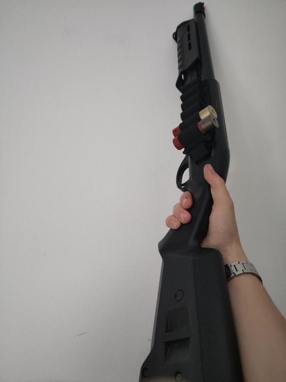 Metal Cyma Trishot that came with ×18 shells ×3 elastic shell carriers for the velcro panel on the receiver M4 mag adapter + High cap mag Pretty nice at £75, a very fun gun and now a donor piece. Designing a triple TDC hopup that uses AEG barrels for the funny, might be able to get a comically accurate shotgun... Mmm triple barrel sniper...2 points -
