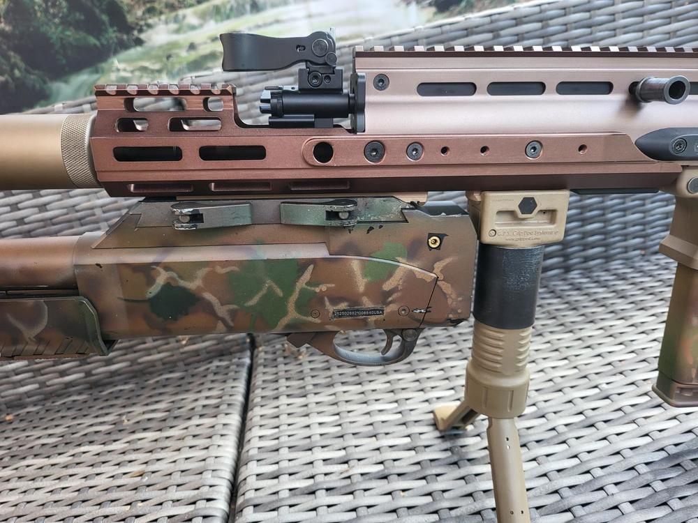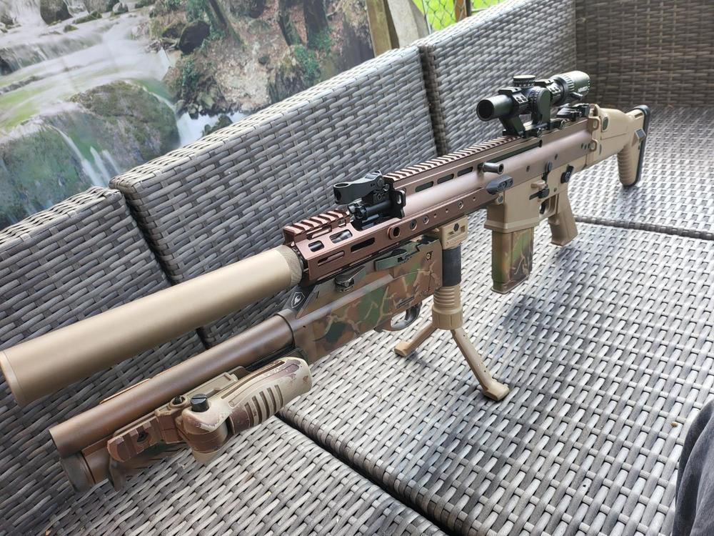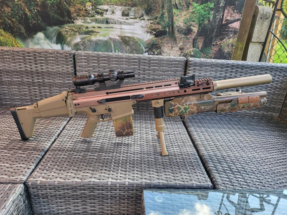 Finally got around to picking up the handguard extension for my SCAR-H DMR. After all the pain of fitting it, I'm not sure I prefer it over the shorter version I was rocking, simply for where the grip and Masterkey now sit (which are a bit too far forward). It's ironic because it was the PR I wanted originally but I couldn't find one at a decent price. Still, it gave me a chance to redress the cam on the rifle and take some shots along the way. Feeling much better now. ?1 point -