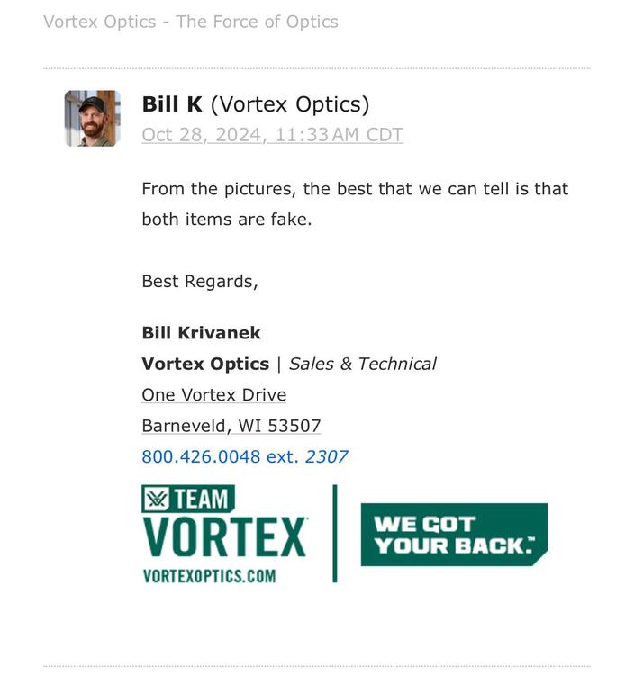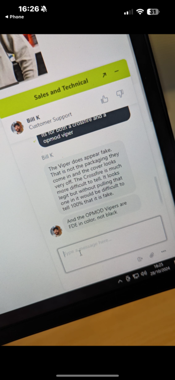 I thought I would leave a little post here for people to read through after a bit of a disappointing experience for both myself and a friend on this forum. We recently both purchased Vortex optics from the same seller on this forum ( I will not mention a name and explain why later ). Both the vortex crossfire and vortex Viper were both advertised as genuine and new, both for reasonable prices for what they were advertised at. The seller had great feedback, even a moderator or two had purchased from the seller and left positive feedback. the seller was not robitic and did not seem to be a scammer in any way. A deal was made for both optics and both of us WERE (past tense) very happy. After both being excited we started looking and the optics on different load outs and noticed some odd things with the sights. We had a good communication with Vortex optics in USA and they looked through the adverts and the some of the sellers other adverts and suspected that they were both fake for various reasons. Words were spoken with the seller and a refund was sent for the crossfire but suggested that the viper opmod looked a great condition. the items arrived and vortex was contacted confirmed both were fake. I had previously purchased a spitfire from a genuine seller on here and it came with everything, very good condition for used and confirmed it was real. the crossfire for people to help identify this in the future - arrived sealed in the box, all protective covering, user manuals etc - the paint is hard to describe but has a slight shein to it, the original is more matte coloured. - the dust covers for adjustment has writing and arrows internally( original does not and confirmed) the cog shaped part of the adjuster was not as prominent as the fake aswell. - the writing under the riser on the bottom of the optic was a different font for the serial number - the battery tray had some minor differences with the circuit board numbers also being different, solder joints were not as clean. - clarity was not as clear either As suspected All in all, even vortex said it was a very good copy but they could still tell very quickly. Viper opmod identify First thing I noticed was that there was no seal on the box! There was no manual in it either and finally the rmr rail wasn’t included in the slot in the centre of the box, however it was mentioned it didn’t with the sale. No protective wrapping on any components, tools or battery advertised as new but the bolts had obvious signs of wear and tear - OPMOD only comes in FDE - this was all black - Viper plasti/rubber cover had no markings on it all - a genuine gas vortex logo engraved - OPMOD is written on the side of the Viper - this one did not have that either - blue tint when looking through the optic - writing was slightly off on the font - lower cover doesn’t line up perfectly with the alignment dowels at the front - I removed lower plate to access battery and seal had been squashed on the one corner, battery was fitted and had finger print marks on it - vortex confirmed to be fake for the above but also the circuit board was different to what they use, I didn’t have one to compare with please see attached photos if your interested in seeing if yours may have been miss-sold or scammed. I am not saying that this seller is a scammer or running his name through the mud, he could be genuine, he could be a really nice person and this was all a mistake but my trust in them is shattered and I wouldn’t ever purchase from them again, I would also advise that others be weary when buying a vortex! I have left their name out of this for respect of the fact he ended up letting us keep both optics for £30 total. I have print screens off all our conversations and emails from Vortex optics. My friend who is on this forum also has screen shots of all of his conversations. HOWEVER… THE SELLER IS STILL ADVERTISING BOTH PRODUCTS ON HERE, EBAY AND USED AIRSOFT… LISTING HAS BEEN CHANGED TO REPLICAS ON HERE BUT SAME PRICE PLEASE BE CAREFUL ALL !!2 points -