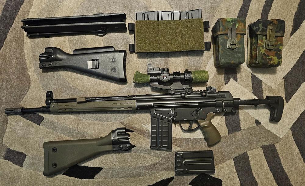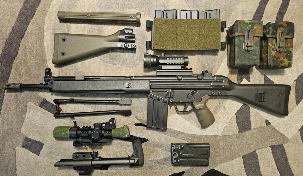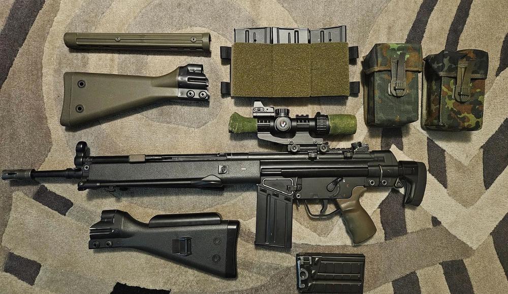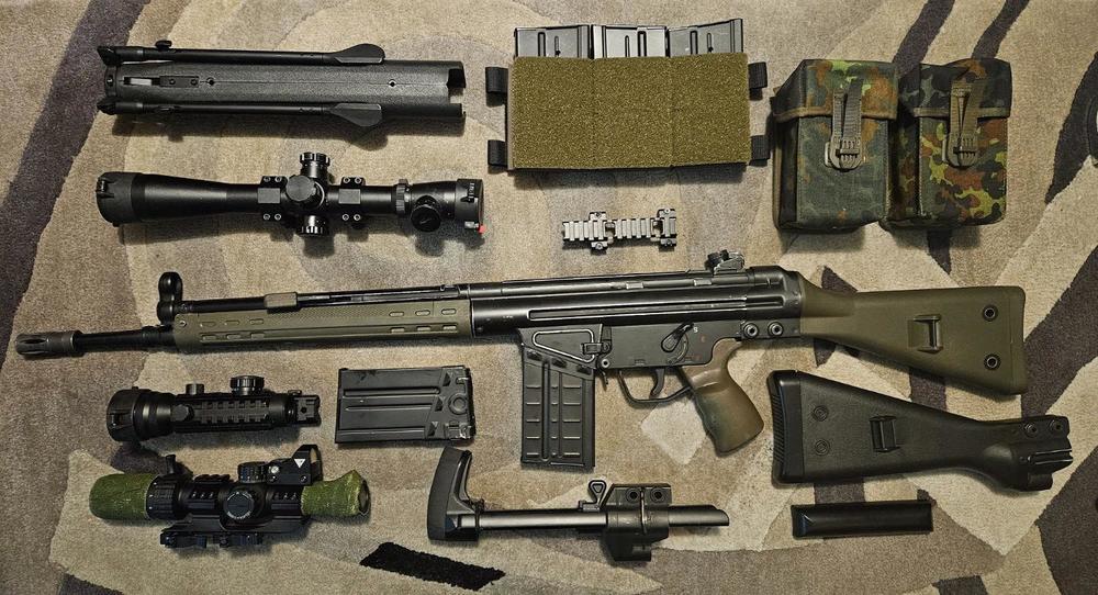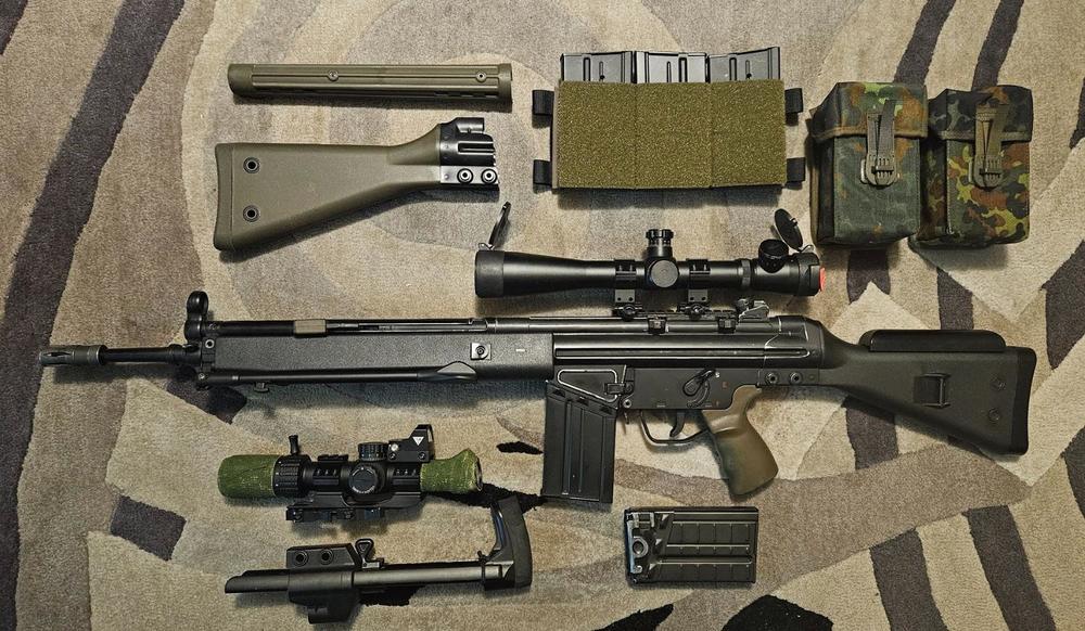 I've wanted a G3 for the best part of 20 years, not sure why it's taken me this long to finally get one, and by one.. I mean a G3 and all the bits n bobs to claim five guns in one ? - such a modular system for it's time ? Started off life as a Classic Army G3SG1 Standard G3A3 config with the slim hand-guard, no rail up top, bare bones... still probably my favourite config (LCT hand-guard and stock added) : G3A4 with slim hand-guard: This is how I've currently got it setup... but where does the battery go? ? Then we have the A4 with the wide hand-guard; with bipod in this case, technically making it the cod4 configuration I believe: Then the A3 with wide hand-guard - my least favourite config tbh: And then finally the G3SG1 : A few notes and ramblings on this project: By some measurements of an HK RIF this CA was a piece of crap - cocking lever made of literal margarine came flying off after maybe 5 slaps... wth is the point in having an HK replica if I can't slap the crap out of it. Anyway replaced that with a steel LCT cocking lever. slap slap slap slap... too many times a day ? - needed some minor modding to fit well with the CA cocking tube. The LCT furniture is NOT compatible with the CA (TM) style body and front set - both slim hand-guard and OD stock needed an annoying amount of dremeling and filing to get them to fit - but they did... eventually. LCT ribbed magazine also needed work - too tight of a fit for the CA metal body - filing of the shell needed as well as the well known fix for LCT mags - shim up from the bottom to raise the feed lips to get it to feed reliably. I've wired in a second battery harnesses through the receiver - one to the front for A4 and one to the back for A3 configs respectively. A4 stock mod 1 - added lock grooves all the way along the sliders to allow one inch increment stock position adjustments, the Original A4 stock had two positons, fully open or fully closed - I like to run mine 1-2 inches shorter than fully open: A4 stock mod 2 - I love the look of these, however they are quite uncomfortable as they sit into your collar bone, firing a real .308 off of one must be nasty. Replaced the hard rubber but pad with an inch of EVA foam cut to shape and screwed in using the original holes: I plan to add some sort of cheek riser/pad to the A4 system, thinking maybe canibolising an SVD one ? Finally the most annoying mod I had to carry out was to excavate five tons of material out of the LCT slim hand-guard in order to fit a 1300mah 11.1v lipo inside around the barrel - but it's working great now and surprisingly is not that difficult to get the battery in.1 point