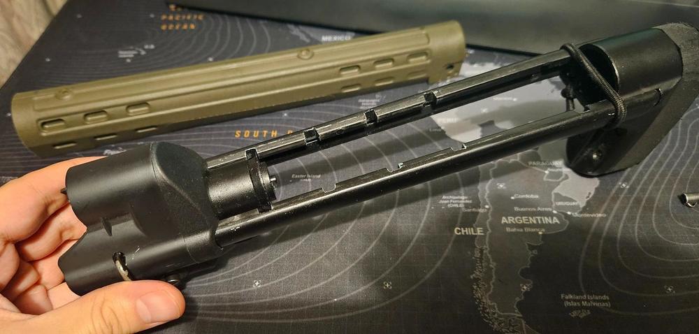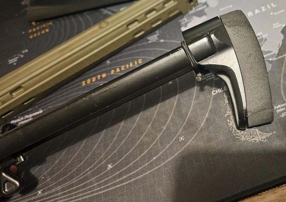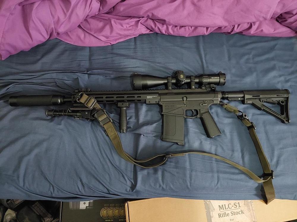 Not quite finished, but it'll do for now. I need to do a Brownells order to get a magpul angle grip, bipod and QD sling point, all m-lok direct mounts, but for now a few picatinny segments and the accessories from my mk12 MWS will do the job. At a glance it doesn't even look like an HPA gun. Alas, the 3d printed tournament lock on the "buffer tube" and the MTW markings are what gives it away2 points