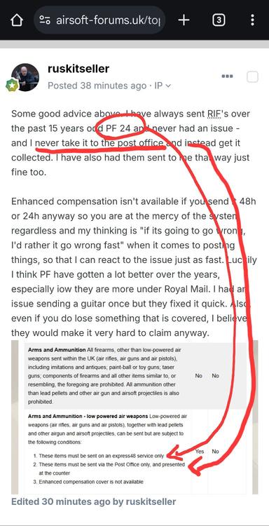 I just think it's best to stick to the rules we have been given I've been sending guns for 20 years and not had one single issue, imagine telling someone to use a different service and that one time it goes tit's up because of your advice, it would suck You don't get any enhanced compensation but you can insure accessories Retailers are allowed to use 24 because it's a business account3 points -