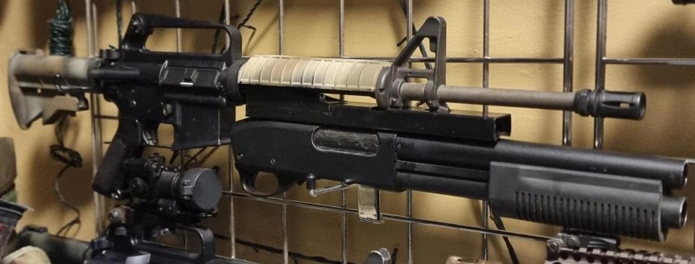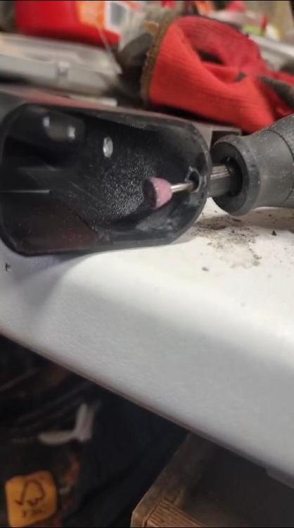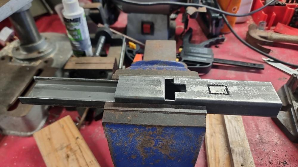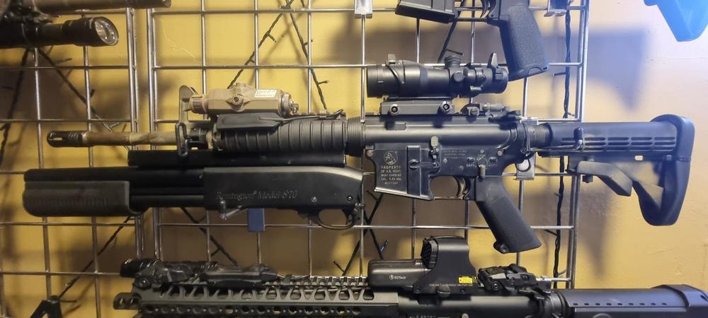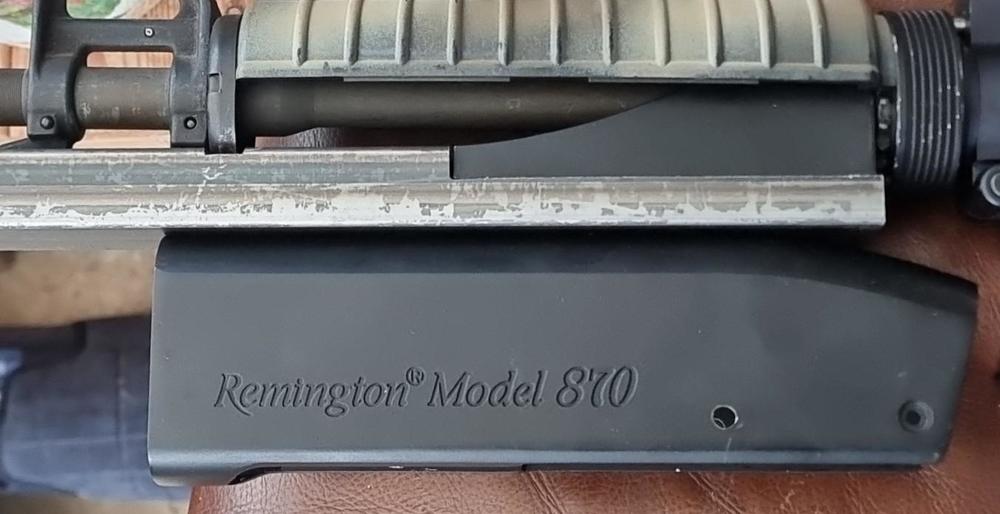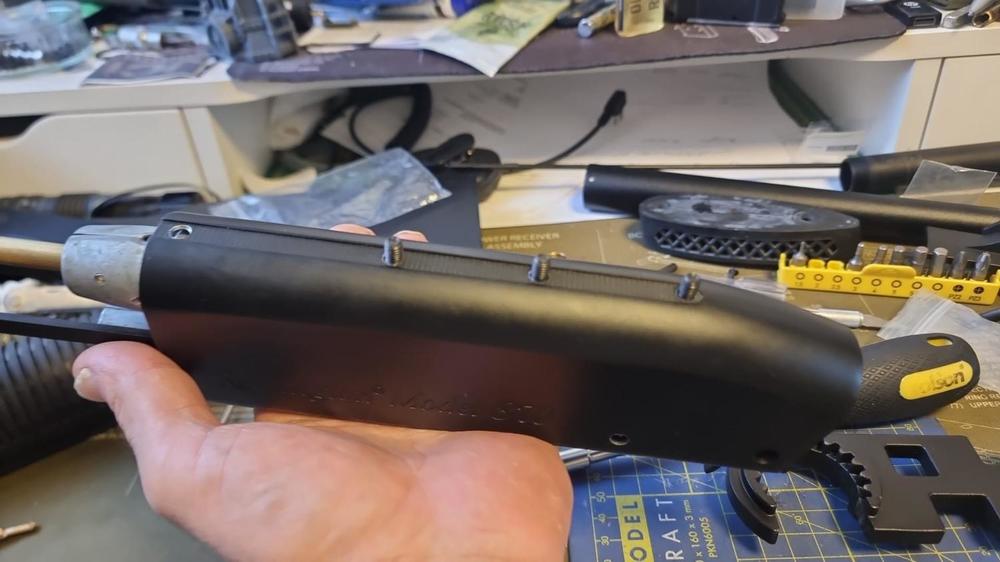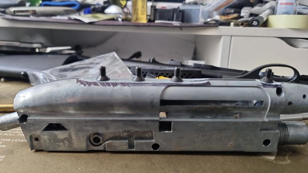 Some folks were curious as to how I did it, so here is a how to :). Materials I used: S&T Spring Remington 870 35mmx20mm steel box section. I used 3mm thick stock. Random barrel mount from an M203 3 M6 x 10 countersunk machine screws 2 M6 x 25 countersunk machine screws 5 x m6 nylon bolt and washers. Tools used : Kentucky Measure (eyes) Pillar Drill, Hand and bench grinder, Various Vices, Vernier Caliper, Dremel, Hand files Tap & Die, Permanent marker, Club hammer, 45mm diameter steel pipe, Ignorance. 3ml of my own blood. Tools I should of also used : Centre punch, Tape measure, THE RULER ON MY VERNIER CALIPERS. Firstly, I obtained some source material from the Google. and then placed my rifle, barrel mount, steel box section, and destocked shotgun on the bench. After about 20 minutes of staring at it, making thoughtful noises, looking at the source material, I decided to make a start. Let's start with the big issue. The shotgun. The S&T 870s are single shot pump actions based on the Maruzen CA870, much like the G&P Wingmaster line... so much like it's identical. I mean, carbon copy identical. However, the S&T is not a smooth action out of the box. It's got sticky points and notches everywhere, the action over-extends causing the right side pump arm to disengage and jam, and lubricant was clearly lacking. Dealing with the action was a simple strip and clean, cleaning up any burrs on edges, or casting lines (of which, there were many!) in the areas where friction is a thing, cleaning up the edges of both pump arms with a file, and finally a polish of the metal surfaces where the pump arms slide in the rails of the cast chassis. I also took the time to modify the inner barrel and hop chamber, it now runs a VSR bucking. After reassembling, it's as silky smooth and easy to rack as my old G&P, and can lift a .32 with ease. So it's definitely suitable to mount. Action still over extending though - we will come back to this. The receiver shell ended up straight on the Pillar Drill for mounting holes. I ended up drilling and countersinking a total of 5 holes. 2 for the barrel mount, and 3 to spread the rest of the shotguns mass along the chassis. All 5 holes and fittings are not pictured as it was done at the end of the process. The rearward machine screw corrospondes to the barrel mounts rear screw orifice. Front hole countersink was done with an unusual but required approach. Onto the receiver chassis! more marker pen followed by using the Vernier calipers to edge my 'measurement', and off to the vice and grinder! First, off with stock fitment followed by material from the top of the chassis to make space for the machine screw heads. Despite the countersinking in the reciever shell, I also wanted to fit a steel insert between the chassis and shell with holes and countersinks to mate to the reciever shells, again to spread the load as evenly as possible. So accounted for this during loud grindy times with a medium grit bench grinder. Always wear eye protection!! Due to how the chassis fits into the reciever shell, the 'bump' at the rear needed to be ground down further towards the back end than i had initially done. So a bit of trial and fit and trial and fit was in order, made worse by my choice to reinforce the fitment with the steel insert. Minor adjustments made with more permanent marker and a dremel. Once enough material had been removed the chassis snugly slides in and out of the shell as it should, with no excess play, with the steel plate and machine screws in place. (This was the point the 5th fitment was decided upon, but this was a 20 second job and worth doing!). Now, those who are still with us - the mounting rail!! Let's start with cutting out material for the barrel mount. Permanent marker and Verniers to action, marked and etched, followed by a disgustingly convenient find of a jig from an old project that needed zero adjustment to achieve both cuts - it was meant to be! A quick clean up of the edges with a file followed by some tappy taps with the hammer to profile those edges in toward the mount slightly. After offering up the mounts chassis I marked the locations of handgaurd cap, bayonet lug, and sling swivel, and transfered those marks using a square, making sure to account for the rearward fitting motion of the mount as I wasn't bothering cutting out the top of the chassis on my first attempt making one. mock fitting prior to the Great Ignorant Beating, as wecan see, shotgun reciever has a curve. My box section does not. Long story short, dismantled the assembly, made a holding jig, and a spacing /centering jig, placed the rail in the holding jig, then on goes the centering jig, filled with a steel pipe with a 45mm diameter. I proceeded to smash the b***ocks out of it with a club hammer until I had achieved the desired profile. - this is something I'll do differently come the MK2 version ? Finally, drilling the holes in the chassis rail to corrospond with the shotguns reciever holes. Chassis fitments holes were tapped, and then everything cleaned in prep for a good application of hammering in a can. Once dry , the reciever shell was fitted to the rail and barrel mount. Washers and nylon thread nuts applied. Cutting down the barrel and ammo tube is pretty self explanatory. But the pump needed cutting down and a new recess cut out at the front for the ammo tube support ring. By combining my brain and my hands I was able to feel out the exact moment the action was at full forward extension without over extending. I marked the required location of the ammo tube support on the outer barrel, drilled and tapped fitment holes I then modified the pump handle accordingly, removing just right amount of material to allow the action to be tighter then a really tight thing with a tight schedule on a busy day. No more over extension of the action as its not physically possible without smashing the ammo tube support off (or proper dismantling procedure). I will soon begin a mk 2 chassis,