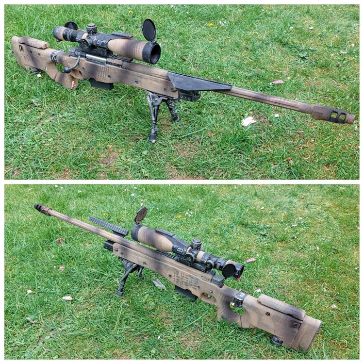 L115A3 This is the ARES AW338 spring version. It's all pretty much standard at the moment, needs some work internally. Externally I managed to source the correct flash hider for this. The brand is calibre, and had to order from abroad. But never heard or seen them since. I know ARES did do one similar for their Stryker range, but the dimensions made it look fatter than it should. I was also led to believe the AW338 barrel is slightly thinner than that of the stryker, leaving their flash hider too loose a fit. I've added extra serial number stamps on the bolt and handle as is done on the real thing. Managed to source the correct Type scope mount, and a replica S&B scope. Then I've had a dovetail to picatinny scope mount 3D printed, correct to the real one. Now at this stage, it is just a prototype. And still working on the finer details. Other part 3D printed, is the L115A3 45° STIC NVG rail. This Is clipped into the front of the rifle as per the real thing. Both parts have been painted an aluminium colour. Then sprayed over with black. Worn back around the edges, giving the illusion it's metal. As I have based this off of L115s in Afghanistan. Most rifles seen were covered in tan SCAPA tape at the time, with some individuals adding some extra colour/camo to their rifles. Similar to those seen on the earlier issued L96 at the beginining of the OP herricks in afghan. Mine is a replication of that, covered in SCAPA, and the paint scheme similar to that of a family members. Also added ranging marks as also seen on sides of the rifles at the time.1 point -