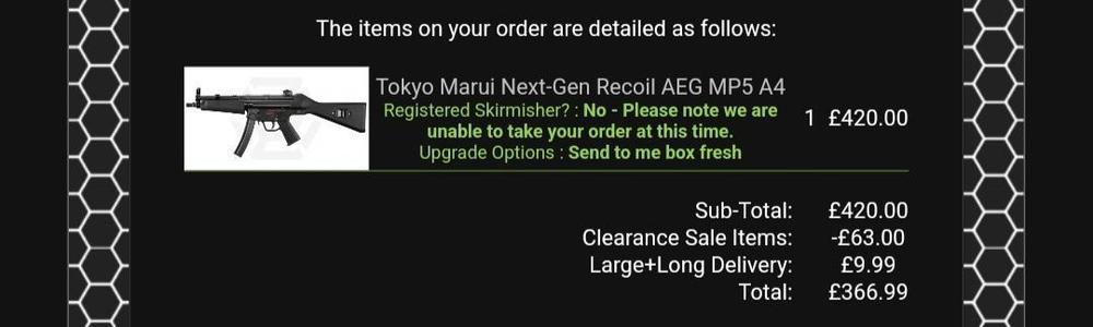 MP5 A4 NGRS from Zero One for £357. https://www.zerooneairsoft.com/products/Tokyo-Marui-Next-Gen-Recoil-AEG-MP5-A4 I have a spare sliding stock off my SD, but will probably put a folding stock on this. Next week is going to be a good week for stuff arriving.. ?3 points -