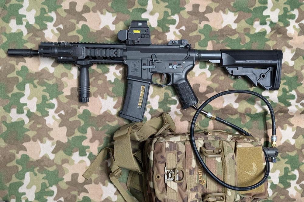 Before going into my findings and thoughts on the Ares HPA conversion, it's worth setting the scene a little. I've been messing around with airsoft (BBwars anyone?) for close to 35 years. My first BB gun was a model kit of a S&W pistol that once built fired 6mm BB's. It lasted a few mags worth before I accidently landed on it while sliding over my mates Ford Capri bonnet while trying to shoot him. I'd probably get arrested nowadays if I tried that in Taunton again. In the following years I've owned pretty much every different style of airsoft replica. Not only every weapon type but also every mechanism that makes them fire. I've still got a GBB smg that takes duster cans that you screw into a hose, PTW's, GBRS, recoils, mosfets, snipers, both spring and gas and any other fad that has popped up. I've never really wanted a HPA replica for a few reasons, 1. it seems a bit of a faff, b, a lot of HPA'rs seem to be running around in lycra with drum mags hanging off a pistol and 3, I'm not much of a scuba diver. This changed when I was at a boot sale recently and someone was flogging a tank and regulator and with the Ares V2 HPA conversion popping up for sale, I thought it might be time to give it a try. Buying these parts looked to be at least removing some of the faff that I couldn't arsed with. Turns out that wasn't the case but that was nothing to do the the Ares HPA engine. Turns out the regulator I bought was goosed and even after watching a few youtube videos on maintenance, it still was goosed. The tank was at least ok until I tried filling it for the 2nd time and the 1.8k pressure valve blew. While I'm talking about faff, the filling of the tank is a problem. If you have access to a dive shop or an airsoft shop that offers a refill service then it's not to bad but the other options are, buy the foot pump or buy a compressor. Now I live in Wiltshire and since the sea is very very far away, there are no dive shops (or airsoft shops for that matter). I went for the cheap option and bought the foot pump. I filled the 3000psi tank up to 1000psi, went and lay down for an hour and proceeded to go buy the compressor. If you are old and unfit like me, or young and unfit or young and fit, don't buy the foot pump. Go buy the compressor but make sure you change the filter every fill as they get wet quickly and water inside a compressed bottle is a very bad idea. So I now had a compressor, HPA engine, air line, knackered regulator and knackered bottle. Thankfully the very helpful DJM94 from these very forums was selling a tank, storm regulator and air hose, which he kindly dropped off at his local airsoft shop for me to collect. I now had everything I needed to set up a HPA gun. My donor AEG was a ARES AM-008BK as I had one sitting in the gun rack. I didn't try to fit it into any other M4 style receiver as I thought I'd try to keep it as Ares intended and fit the HPA engine into one of their replicas. This turned out to surprising easy which was a case of stripping the AEG gearbox out of the AEG and fitting the HPA inside. I had to remove the screw from the bottom the pistol grip for the hose and the only really other annoying thing was the stock tube screw was too short so I had to order a M5x100mm from Amazon to put the whole thing back together. It would have been nice for ARES to include a couple of different sized screws with the HPA engine but sadly they missed this trick. One other thing I did was add an O ring to the plug that you connect your air line to. You can see the connector I'm talking about in the picture above. Adding the O ring stops you accidently disconnecting this connector when you plug in the air line. The last modification I did was cut off the XT30 connector and run a longer pair of wires with a Deans connector so that I could fit the wire down the stock tube and stick a 11.1v Lipo battery inside. The Ares HPA gearbox has the cutouts in the gearbox shell for this so it's a pretty simple task. So with everything connected, a full tank and flippers and wet suit on it was time to test. trigger response - fast rate of fire - 16bb's per second FPS variation - 1 FPS over 20 shots accuracy - surprisingly good for a stock hop rubber and inner barrel. misfeeds - none problems - none. Sound - very quiet Overall, this seems like a pretty simple way to get a HPA rifle. The low rate of fire means it's unlikely you will be donning lycra and combat rolling your way through the game zone. The lack of variation in the FPS is very nice, meaning that if your aim is true then shot to shot accuracy should be pretty good. Cost of the HPA engine is cheap compared to other higher end systems however if you shop abroad you can get it even cheaper (£115 from sixmm opposed to £200 in the UK but warranty will be an issue if bought abroad). There are other initial costs to consider if you are thinking about going HPA: compressor £160 Tank £65 airline £21 regulator £70 upwards Wet suit and flippers are option. final impression. It's a very quick way to get into HPA. I'm unlikely to sell all my other guns and go buy a bunch of lycra but I do see the appeal. Once you get over the faff of filling tanks and have all the bits it becomes just as accessible as an AEG. The consistent FPS and low noise make it nice shooting experience. One 3000psi tank will do about 1000 bb's on the Ares HPA engine so a 2nd tank might be worthwhile having. Now that I've lost my HPA cherry I think my next HPA venture will be the VFC M249 converted to HPA tank and a AEG nutsack.2 points -