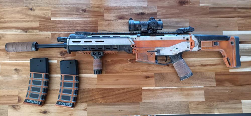Since I bought a PTS Masada I had the A&K laying around... Was thinking about selling it but I think I'm better off this way Lonex flash magazines painted accordingly, cheap Amazon red dot to be used on this one and on the M14. Painted using Fosco spray paints, Warhammer transferables for markings, serial number, etc., miniature pigments for weathering. Silencer and grips wrapped in my girlfriend's AliExpress boob tape ?1 point -