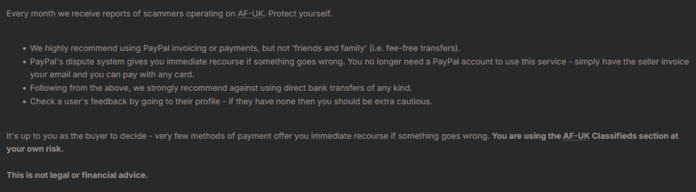 Not going to add any sort of post requirement before accessing the classifieds and probably never will. Whilst this does leave users slightly more vulnerable to scammers the classifieds are the primary access point for new members (some of who eventually become frequent contributors to the remainder of the forum). I'll also add that the relative success of AFUK's classifieds is that it allows buyers to contact sellers far more easily than some similar platforms (which then translates into items selling more quickly). If a change was made to accessing the classifieds it would probably work for an extended period of time but there would be a drop-off in new listings on the classifieds in the medium to long term which would precipitate as less content overall on the forums. Facebook and Discord are not only popular because everybody is already on there (in many cases multiple times a day) but because you don't even have to think about doing any amount of legwork before contacting a potential buyer or seller. Closing the gap between forums and big services like this starts at having as little extra work for new users as is feasible. The above is also why care has to be taken before adding new sign up requirements in order to help prevent spamming (I'm sure everyone is familiar with just how much of this we get). There is currently a cap on how much 'content' you can post/create before you reach a certain account age - this is intended to be one of a number of small things that frustrate people spamming and scamming at scale but it is a bit of an arms race with no solution that doesn't come at the cost of significantly lower new registrations. Did consider a 'bond' at one point of a similarly small amount which would be refunded after a specific period of time but this comes with loads of real life liabilities. Also as above any non-refundable small contribution for buyers and sellers would probably be catastrophic for fresh sign ups I'm afraid. I am likely going to add a new notification to make this more prominent to new members. As it stands there are two notifications that you receive as a new member and it's likely that adding a third won't help. There is of course the floating permanent notification at the top of the classifieds with a warning and some very basic guidelines. Any concise recommendations to add to this list of tips would be greatly appreciated. I've asked for clarification on this but for now the forum does not notify of new classifieds on Discord as we're probably not allowed to even link to new listings under these new guidelines. Although it's not exactly foolproof prevention of anybody who does a little bit of research on this (thankfully most scammers seem to be pretty thick) we do screen IPs (for anti-spam purposes more than anything) in order to catch VPNs etc. (to the degree that it is feasible to do so). Agree wholeheartedly. This is the first recommendation in the list recommendations given at the top of the classifieds for a reason. Anybody looking to save a couple of quid on a transaction of hundreds of pounds with somebody they don't know is asking for trouble.1 point