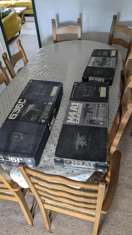 I got home from work last night to find these on the dining room table.... The previous owner gave up Airsoft years ago and was about to bin them all when a chance conversation about Airsoft led them to be dropped off at my house.... They're at least 15 years old and in need of some TLC but blimey. Day went from meh to WHOA!!!1 point -