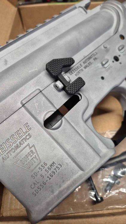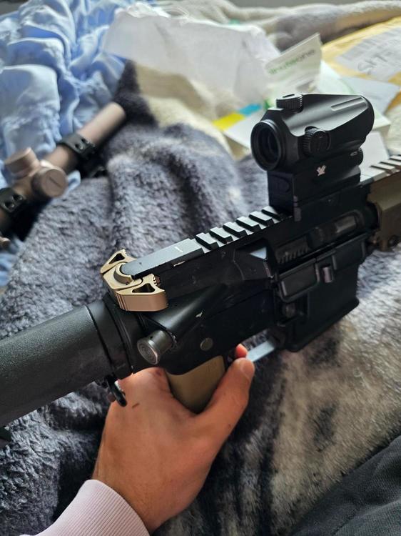 Not me, the wizard @Anonymoose again. He worked some of his spellcraft yesterday, started by trimming down the side locating tabs on 2 different AR AEG outer barrels that weren't quite compatible with the 2 upper receivers in question (noq sit in beautifully), then also fixed some of china's mistakes and drilled some new holes in a QD attachment lever for a PTS Unity Aimpoint micro mount. The big job was converting this real Geissele bolt catch to fit on to an AEG lower (and obviously not protrude inside so there's room for the gearbox). There were MANY steps to this, far more than I've shown, and he also made a custom little piece to sit inside and secure the lever, since a real one would have its' internal segment and a bolt carrier holding it in place.1 point