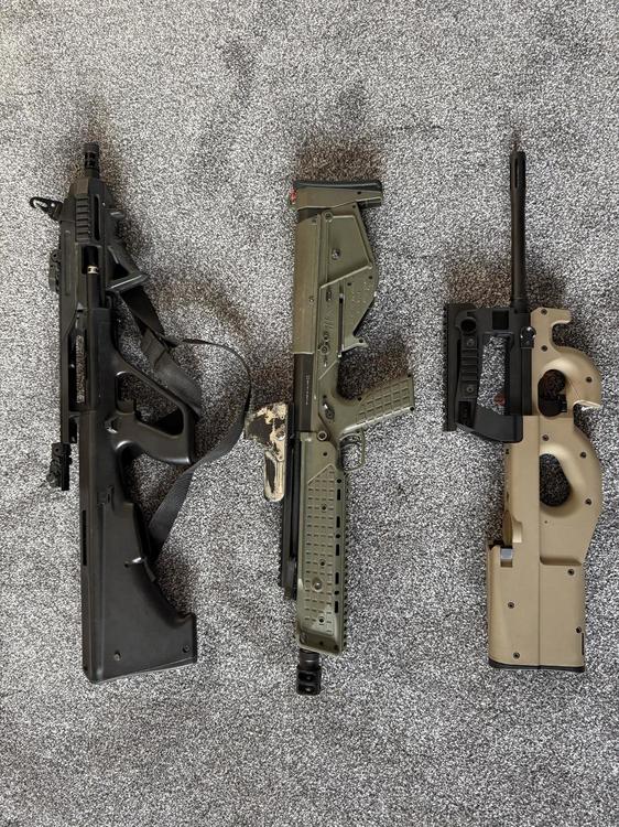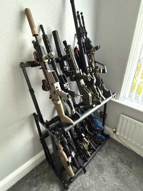 Finally getting around to posting after faffing about moving house. Picked up a boneyard JG AUG A3. The internal wiring is a mess and luckily another user on here had a Perun AUG MOSFET for sale. Now I just need the free time to work on it. Picked up a Ares Kel-Tec RDB17 for less than half the price of retail and the seller added a big flash hider which suits the rifle way better than the standard one. The seller also included TWO extra MOSFETs that come standard with the RIF which doesn't give me the greatest confidence about how well built the electronics are but I guess i'll find out. Sounds pretty snappy on an 11.1v lipo and the externals feel great. Definitely going to give this a run out when I next get to the field - I just need to figure out if my mags work with it as i've heard these RIFs can be pretty picky. A King Arms P90 and the extended barrel intended to mimic the PS90. Got it on sale from a retailer and found the extended outer barrel for ~£10. The same person selling the Perun AUG MOSFET also happened to be selling a P90 MOSFET so I grabbed that too. Not pictured: another boneyard G&G MP5 with some terribly applied two-tone. The charging handle had been snapped off and the gun is now in many pieces as I wait to replace the broken part(s) and strip the two-tone paint from it. For the new house, to clear out most of my bags/cases laying around, I bought a rifle rack/stand from ebay. It's kinda crappy but it works.1 point