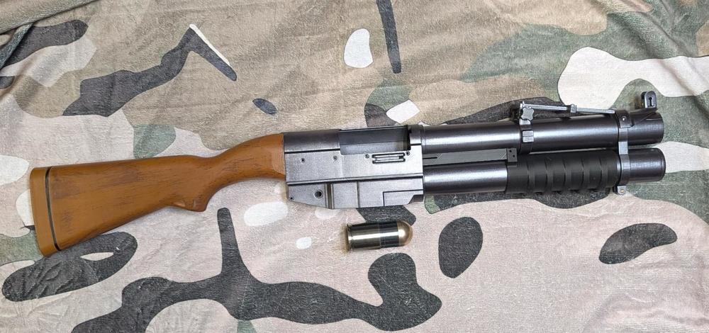 At a stage where I'm happy to share the progress on this. China Lake 40mm grenade launcher. It will be a 3+1 40mm pump action grenade launcher. Externals are pretty much done and just waiting on some parts to make progress on the internals. All 3D printed in a mixture of ABS, PLA and Wood filament. There are a couple of parts that I'm going to CNC in metal (looking at you pump arms) but the 3D printed ones will be good enough for testing.1 point