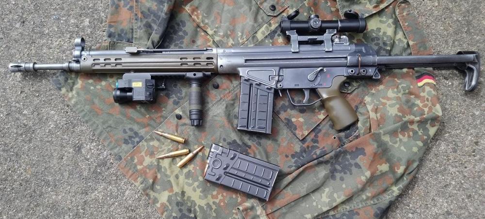 Having done up a replica G3 from an old TM version made from parts. I wanted a scope on it, but didn't just want an ordinary scope and didn't wanna pay for the scope that goes with the gun in the real world. Anyhoo, I started with a cheap 4x40 normal scope and cut it down. Emptied it out and put a bit of 30mm pipe on the back. I had a TM MP5 claw mount and cut the top off, filling any gaps in with milliput. A friend 3d printed some spacers and I glued them to the scope I was using. I glued various spare caps on and put a real G36 3x inner scope part to have some sort of sight picture through it. Sprayed up black and flip up end caps to finish. A bit later on I decided I wanted the more modern type lower that I'd seen with the German soldiers in Afghanistan. I used a cheap MP5 Navy lower and filled in the embossed bullet symbols. Sprayed it with bumper paint and drew on the selector markings. I bought a real selector lever from D&B Militaria and drilled a new hole to slot it right through to the other side. It may feel like a long winded way of making it but apart from the lower I already had and the selector which was only a couple of quid all it cost me was a bit of time.1 point
