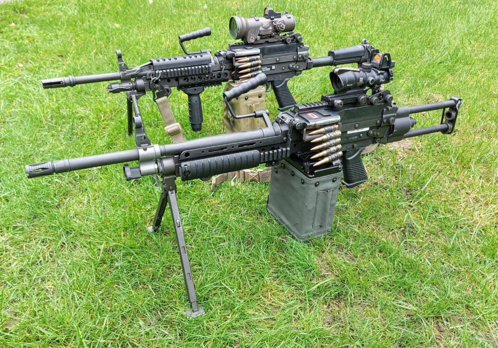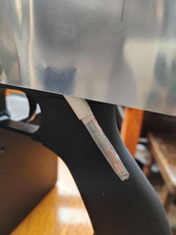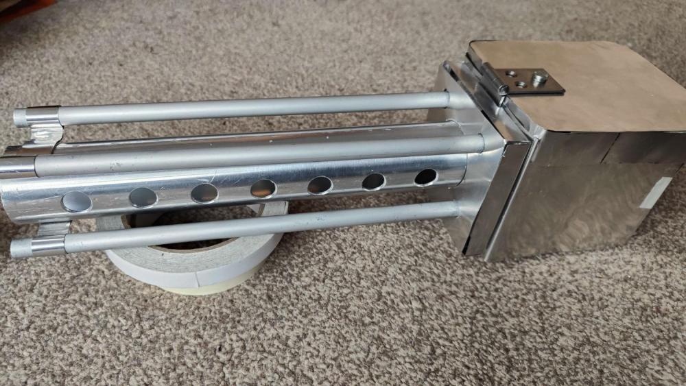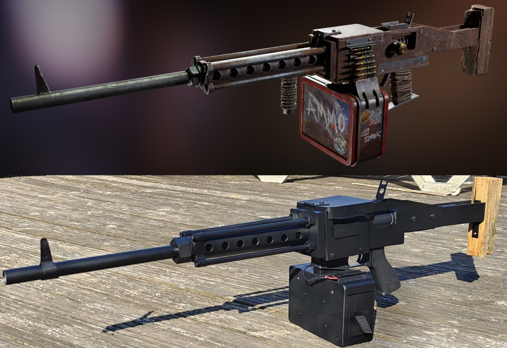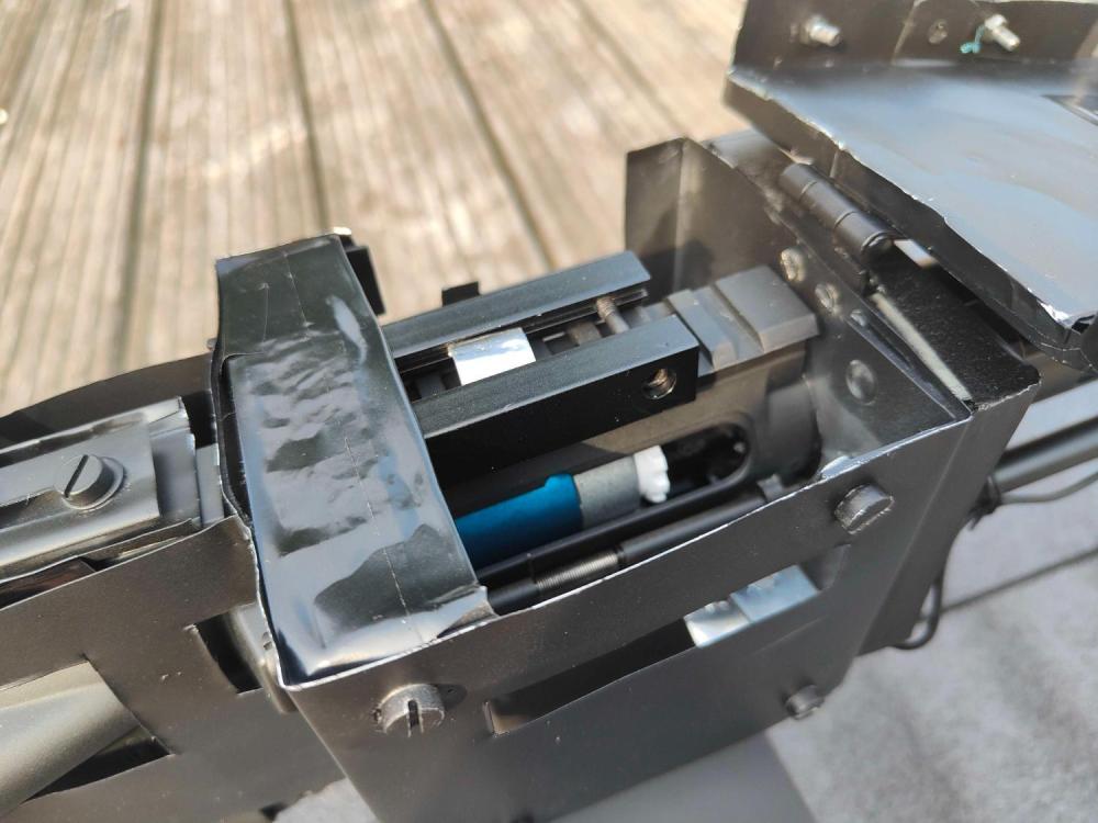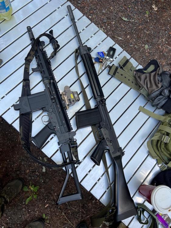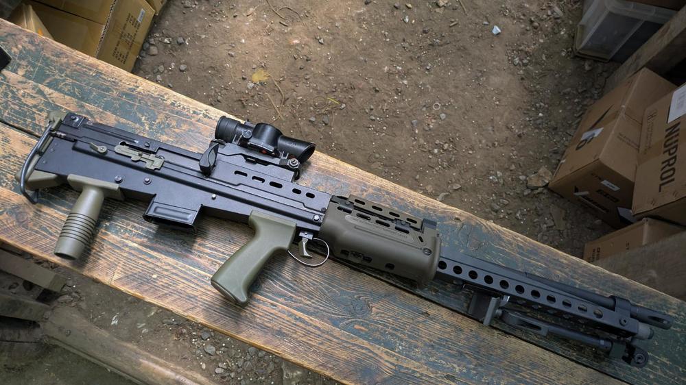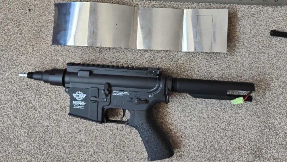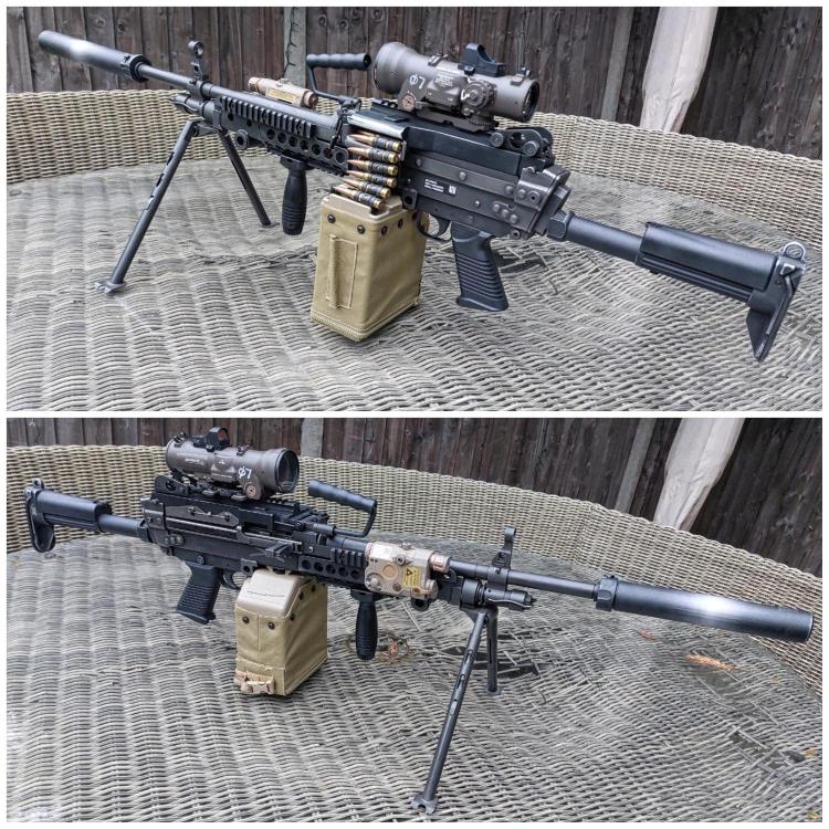 Hi all, been a few years since I made a post. Just thought I'd share my build of the HMLMG from the video game Rust. I think its one of the coolest looking craftable guns from the game, and since seeing it I've always wanted to have an working airsoft version of it. HMLMG stands for HandMade LMG, hence why I thought it would be possible to actually do this project with the limited tools & materials I had. One of the things I didn't want to do for this was to damage the base gun, so attaching this HMLMG "case" to the base gun was a bit of a challenge, but in the end everything is removeable and the base gun underneath can be extracted completely unharmed. The build: -Base gun is a G&G Firehawk (DSG version), chosen for high RoF but also the loud sound that the Firehawk makes. -Box mag from the G&G CM16 platform, perfect shape and positioning compared to the source material (but yes it also takes just regular M4 mags). -Aluminium sheets for main structure (easy to shape without needing machinery, still relatively durable). -M3 nuts & bolts to hold most parts together. -Bit of fence from garden for stock. I used aluminium sheets for the main "case" of the gun which just goes over the base gun, cut to shape and held in place using nuts & bolts. The main barrel is made of aluminium pipes except for the giant hex nut which is steel, and the buffer tube on the rear of the gun is attached by long bolts to a u-shaped aluminium piece. Its all mainly held on by the bolts on the buffer tube, and by a very long extended outer barrel which runs right to the end of the aluminium pipe, which is then held on by a 14mm CCW piece which is perfect for securing the whole thing to the base gun. Everything was made at home using a hacksaw, scissors, screwdrivers, & aluminium tape, except for the holes on the heat shield & the buffer tube/outer stock which were done at the local men's shed. To access the fire selector I had to make a lever, but it is removable so doesn't get in the way in skirmishes. The mag release is still accessible as the underside of the HMLMG casing isn't filled in and I can just reach my finger up there. The Firehawk's external bits were removed, including charging handle, and the dust cover stays open, so hop-up is accessible by opening the top cover. The weight (without BBs in mag) is 3.3kg, roughly the size of an M249. I mostly tried to keep as accurate to the HMLMG in Rust as I could, but I had to compromise on the front grip as it seems too tedious to attach. The charge handle being a brass knob for a drawer also seems out of place as I want to leave the gun as full black for now at least. Modifications: -Due to the extreme upgrade in outer barrel length, I had to replace the inner barrel using a spare sniper barrel from a M40A3, which then caused the hop-up to need changing to a Mapleleaf 70. On the first skirmish I couldn't find the hop-up sweet spot, so replaced the unit with a rotary hop unit from Retro Arms. -The magazine was rewired to a button that sits on the heat shield as the original feed method was non-ideal. Performance: The gun is largely stock as it was brand new and I mainly did this just for the "look", and the DSG Firehawk's base performance is great from the first few weeks of using it. I'm running it on a 7.4v LiPo, it does around 1.07 joules (340 FPS on 0.2) at 29 RPS, so far found it to have good range and accuracy using 0.28g BBs. Magazine also feeds with 0 issues. Since the gun absolutely vomits BBs I'm changing to 0.25s in the next game just to lower the costs slightly... In the future I may upgrade its performance maybe for 11.1v batteries, but for now I don't see any need. Definitely a bit of a crude construction, but hey it looks the part, is sturdy, and most importantly it shoots like a beast.11 points -