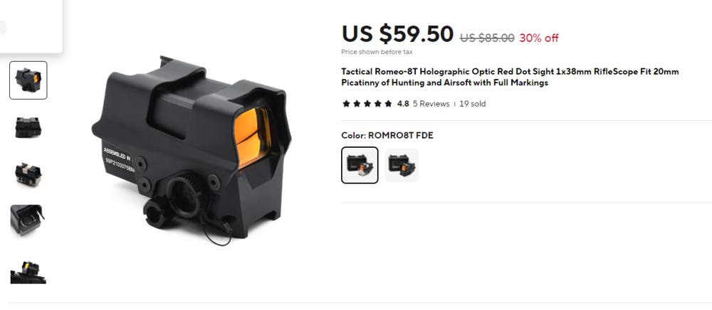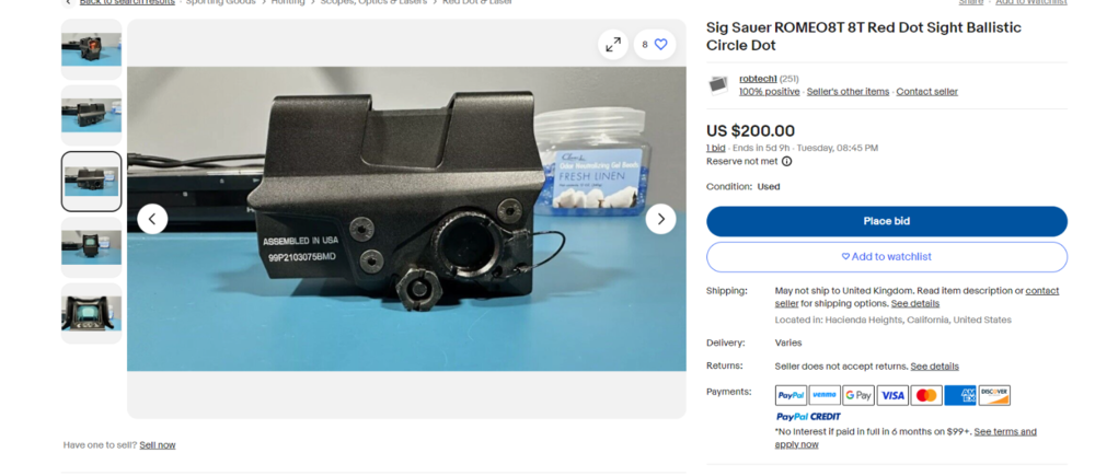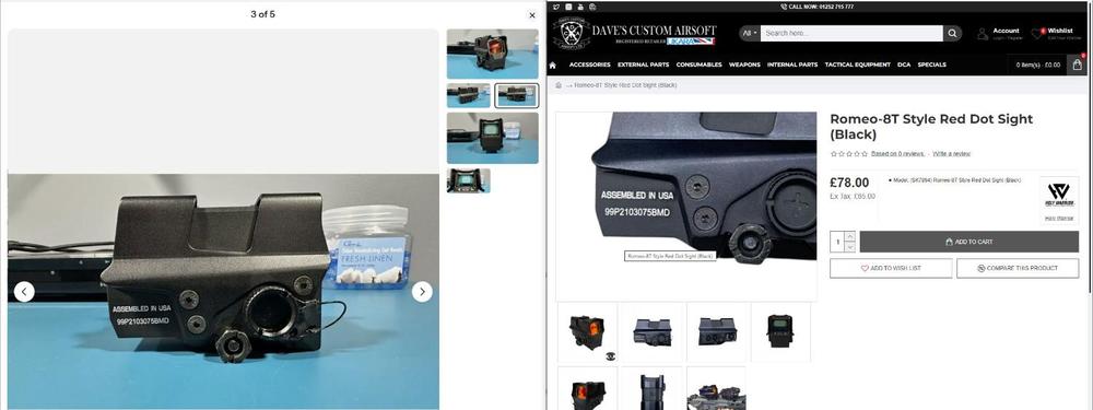 Is this guy selling a clone Romeo8T on eBay, claiming it is Sig Sauer in the item details? Serial number is identical to the Aliexpress clones & the finish looks far too glossy/grainy to be genuine. Also doesn't come with the original packaging...? Anyone with more experience able to clarify if this is actually an airsoft clone? Listing link for anyone curious: https://www.ebay.com/itm/256568056160?itmmeta=01J2GK6BYEKXHGQEEAAZ5TJ0CK&hash=item3bbca5d960:g:olYAAOSw5ERmjZII&itmprp=enc%3AAQAJAAAAwK77nW4u9jWYb48vIm1ZZdHdLfgMIHPE7pnipyX932SNtJ6eiYo0nWcTyarZabJuyEl4V7IdlsG9eWPoZYrNh3tTnkegK7bqVnqgPW3%2FAoFk281qpjsEHbdiVwL0iYJYgqG6mHHfre5tf35AqaEyO3GQonMp%2BTE1qqv0q85pP2g7x%2BqO6qxSKOW7FwN7OT2b70037cGOs6YIFHQMnlIeo1%2BgNr2NS8f1tgqI3o%2BN4NpcdEo1CZ%2Bt2Y3QNSeUMFUlyg%3D%3D|tkp%3ABk9SR6a_mZOUZA Edit: I contacted him and he seems to have taken the listing down. According to him, he bought it from eBay without knowing it is a clone & it in the process of returning it to the original seller.