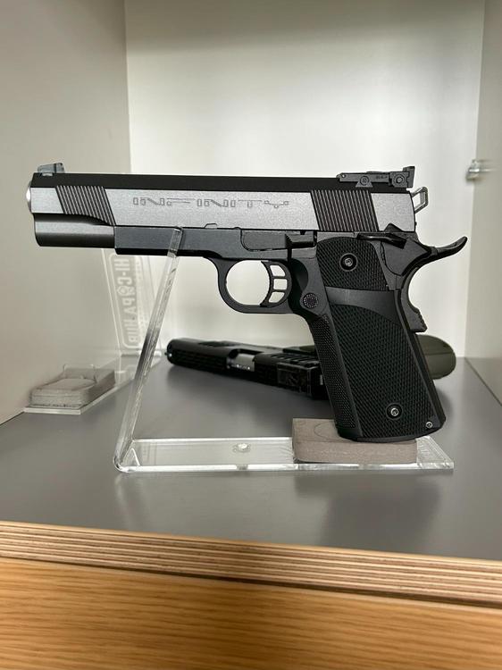 I wanted one of the Infinity Vintage ones by Airsoft Masterpiece, but they are sold out in most places. Eventually I found one in Hong Kong shop. I had wanted black but this one was in titanium grey, which would have been my second choice anyway, so I bought it. I don't generally go for two tone guns and so I began to consider these options for the lower frame: 1. Get it cerakoted grey - with grip safety, slide safety and slide stop would probably come to well north of a hundred quid. 2. Buy a 5.1 stainless and use the lower frame and silver safeties from that - it would be no more expensive than a cerakote job but with the advantage of having a new gun and additional magazine. I know the silvery grey finish flakes off quickly, but I could remove it altogether, polish it up and spray with a clear coat to limit oxidation. 3. Strip off the black paint on the lower frame I already have and repaint it grey. I would have to buy three rattle cans for this: primer, top coat and clear coat. 4. Just leave it alone as a two tone pistol. After all it doesn't look bad. I could even put a grey grip and magwell on it, for the sake of balance. I never skirmish my pistols - I don't even holster them. They get only light occasional use in my garden so I feel the cerakote option is difficult to justify in terms of cost. Is it possible that the TM mock stainless finish might last a bit longer then some people say. After all lots of people still buy that version despite the finish being a well known issue. The finish on the black lowers is pretty fragile too for that matter. What do you reckon?