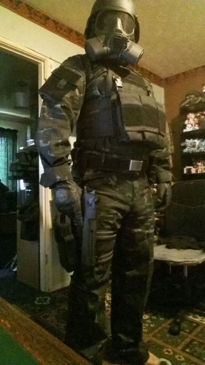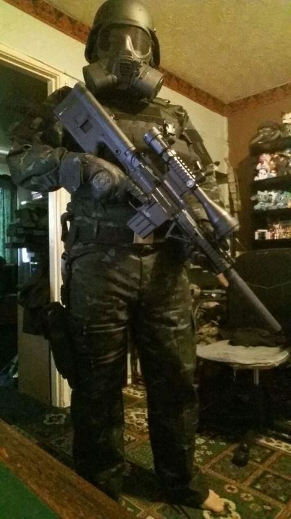 Boredom struck so decided to test fit my black loadout for indoor/CQB and urban games. Tired of running around the same bloody forest every game. Just missing some Umbrella patches now and some elbow/knee pads Hera Arms CQR with 4-14x50 scope. Currently mid-mod into a DMR Cybergun Desert Eagle. Three dual pouches on the chest that take two M4 style or my clamp paired MP5 mags comfortably on the carrier. Small viper pack for misc items/bladder on back. Two pistol mag holders, dump pouch and grenade pouch on the belt. Deagle holster on the right thigh.