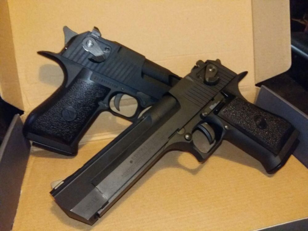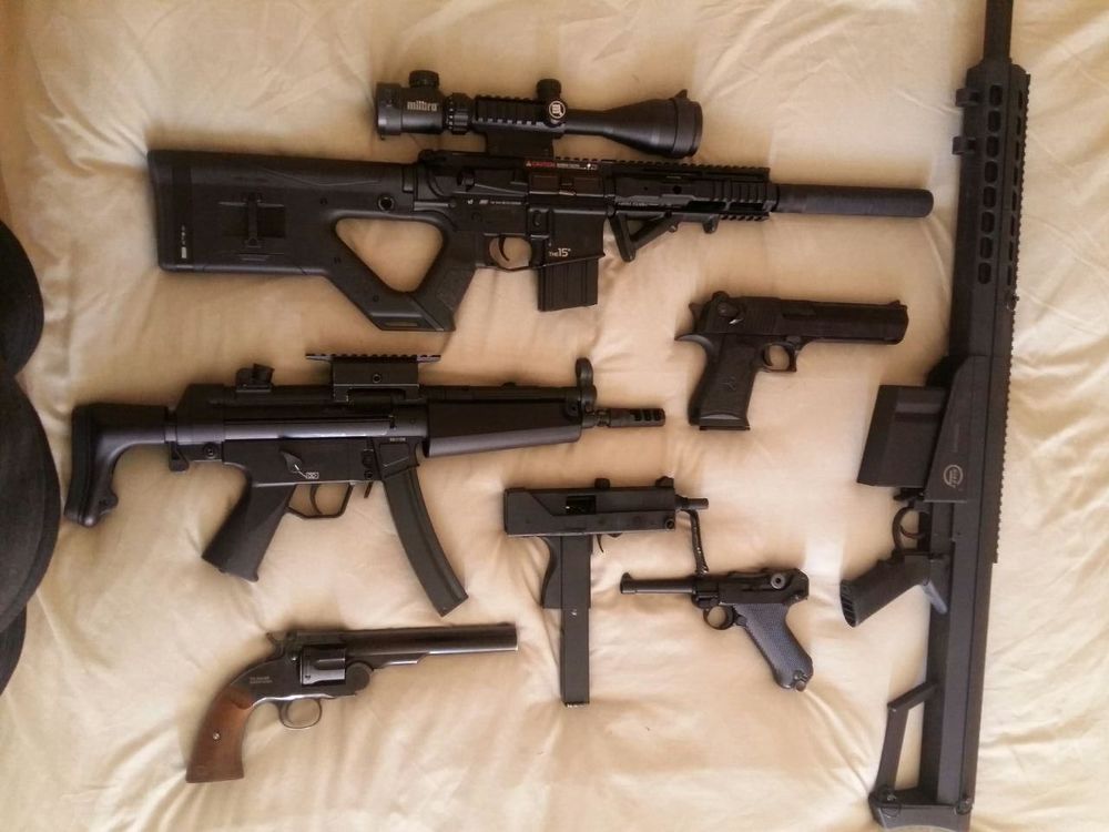 Updated photo of the 'armory'. Hera Arms CQR, Cyma MP5A4, AA Barrett .50 Cybergun Desert Eagle, Unknown Mac10, WE Luger, ASG Schofield Not pictured are the 1889 Winchester lever action and Mares leg