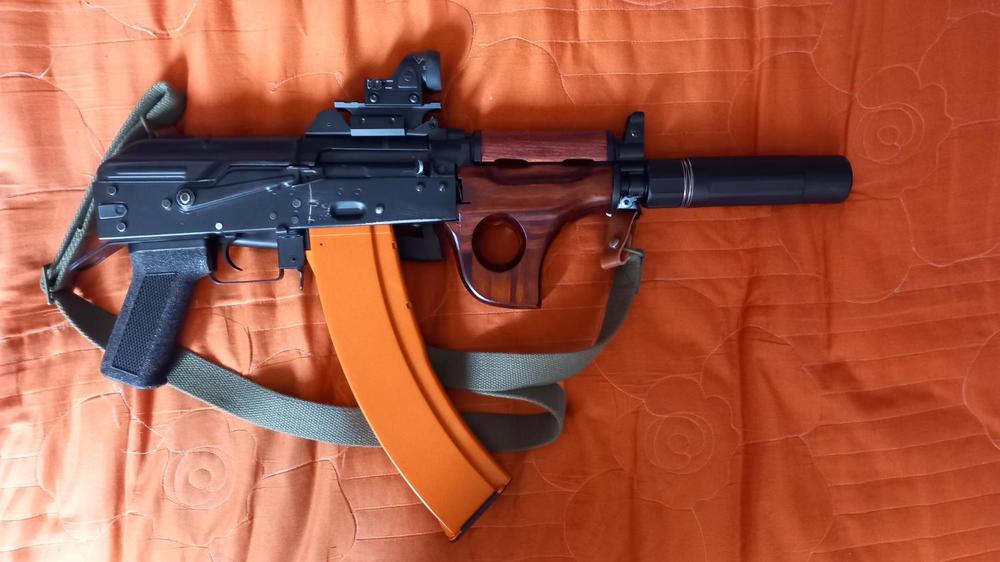 Cyma Aks-74u (CM.045A) 5KU B-18 sight rail Trijicon SRO rep red dot Stippled pistol grip Cyma pistol grip sling plate LCT AKMSU thumbhole grip Hasta nebula Sandman k smoke tracer Cyma rpk 200rd midcap Still things I need to change like the upper wood handgaurd as the color isn't a good match, replace the sling for a surplus one and find a better russian looking suppresser that will hold the smoke/tracer unit