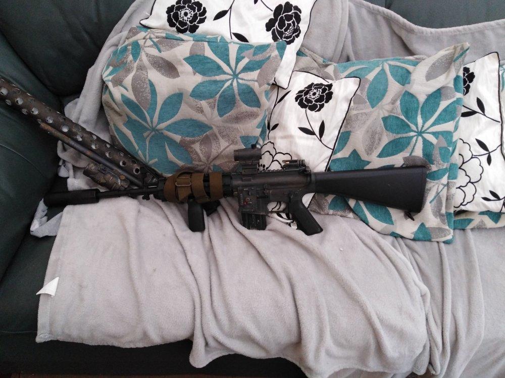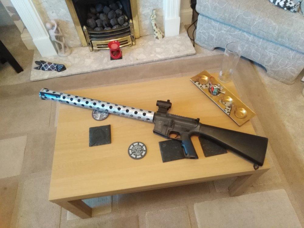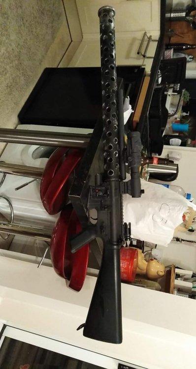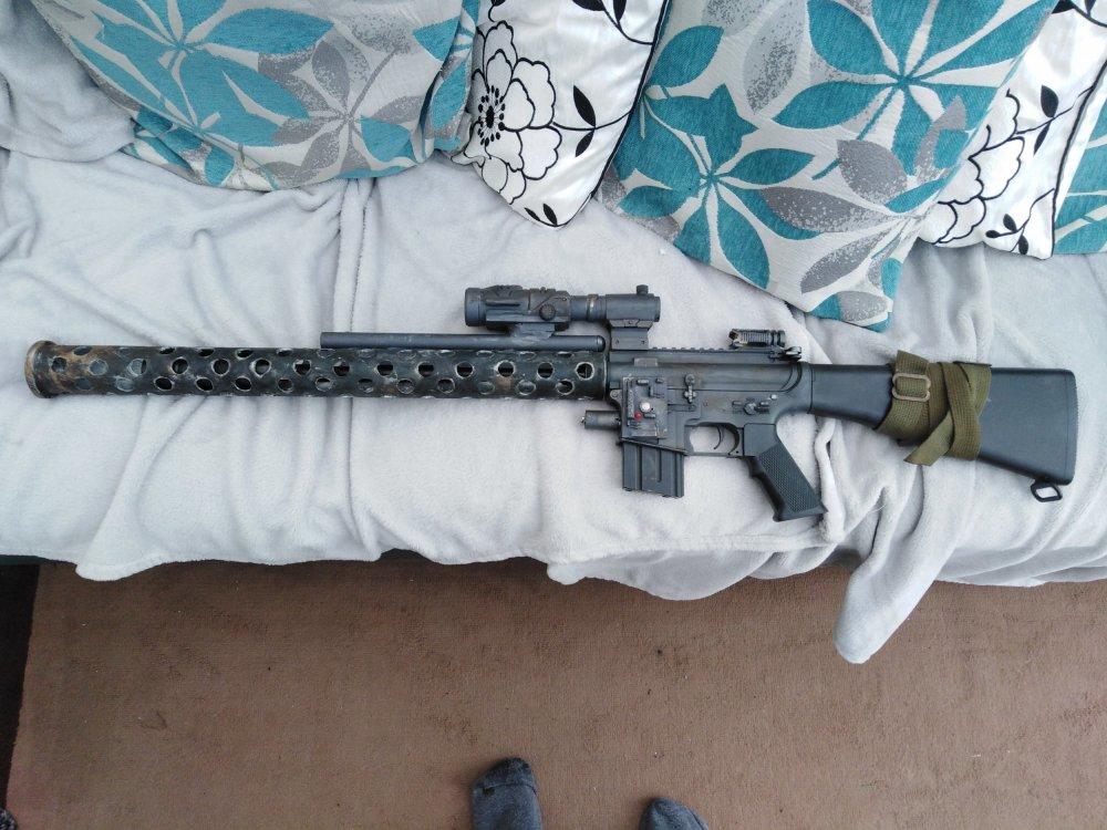I'm about 90% done on this now, star wars DLT 20 inspired thing. I'll probably change the stock, was going to keep it but it will just finish it off, tomorrow it gets weathered. The barrel is chemically blackened, and just needs its heat colouration adding. There's a functional laser in the small diameter tube on top of the vented outer barrel, a tracer unit, and a nerf sight maguivered onto the front of a red dot. Other little greeblies have been added, and there's a couple still to go on. A circuit board from something, the flash moderator is mounted where they put them on the film m16 based guns. So it's all functional. And it's all pretty solid.