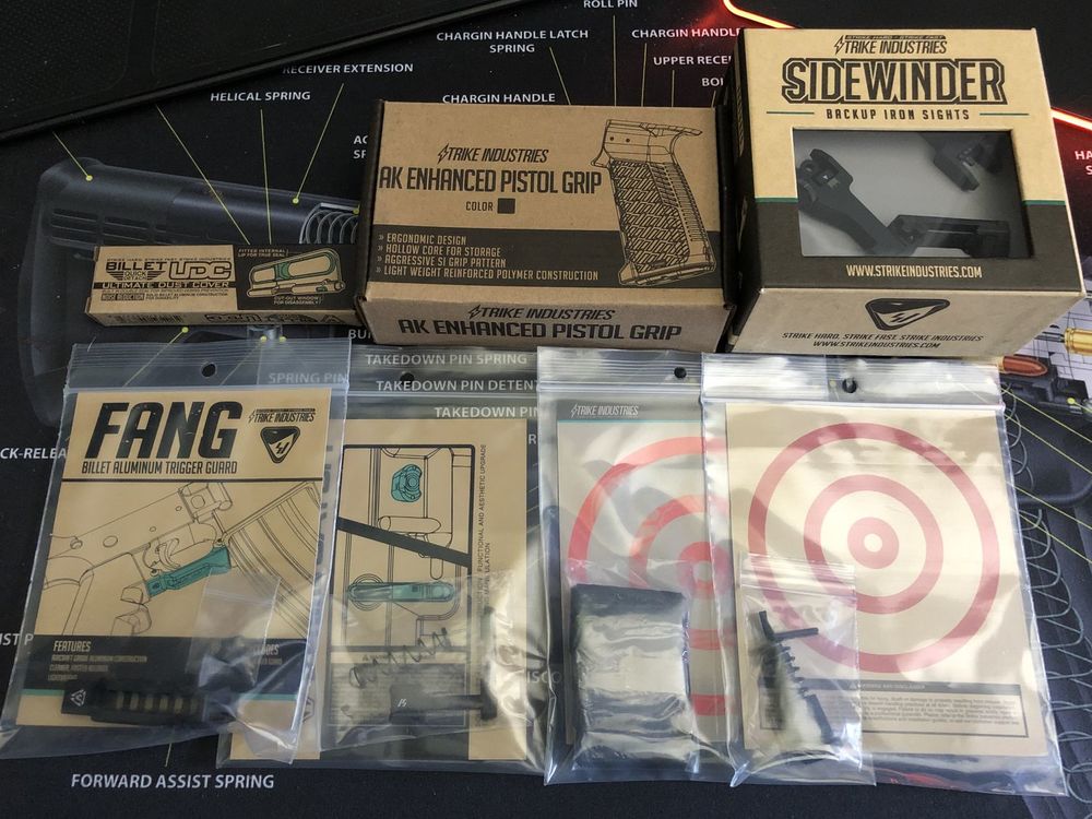Some more Strike Industries parts arrived . Means the MWS is nearing actual completion, that is, if I stop browsing for new shit to put on... Also a a new grip for my AKM, really didn't like the original grip so ordered one to get free shipping, win-win! So next to the AK grip we've got a set of silly, completely unnecessary but cool looking 45 degree back-up iron sights(which can also be used as lower 1/3rd), a billet aluminum dustcover and trigger guard, a magazine release, a forward assist and some M-Lok covers! -