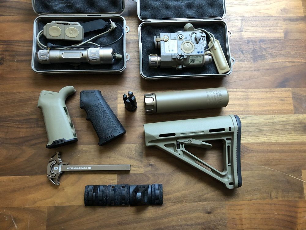 So far I've had no problems ordering from Asia really RMDavis, can't say I even noticed any delays. Ordered a few things from Angry Gun, ShooterCBGear, Samoon and J.K. Army, all arrived within about a week, mainly depending on customs. Not sure how UK customs fare compared to Dutch customs though so your experience may differ. Also, pre-welcome to the club! On a sidenote, having just completed my Block II FSP I want to move forward to another project, thus selling some bits and bobs of my build, including a bunch of original MWS parts that I have replaced with Strike Industries parts (my Strike rifle being the only complete MWS I'm keeping at the moment). Figured I'd post here first as I'd prefer getting rid of everything in 1 go. If you are interested in (preferably) the whole package or have questions regarding the parts, send me a message. The grip, stock, rail ladders and XTM kit are real Magpuls, the sights are PTS Griffin Armament replica's with offset and normal mounts, the rail is a Cerakoted Madbull rail. The charging handle, flashhider and suppressor are Angry Gun and the PEQ15 Green laser and the flashlight are Element.