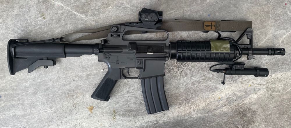 TM M733, Vortex red dot, TacBelts minimalist sling, Scout light clone on genuine Magpul mount (butchered by me) and an E&C non-clone correct grip (fight me!) Internally it has 16:1 gears short stroked 4 teeth (2 pickup / 2 release) shimmed and Warhead HS motor. XT M110 spring is giving 275fps (+/-1fps, ~1J) on Warhead 0.28g BBs and a grouping of 30mm at 10m from a clamped position. ML Macaron 50deg and hard nub do the hard work there! Response and rate of fire on a 7.4v 20c LiPo is excellent without getting into w*nker gun territory and resorting to MOSFETs and such. I am after a rubber stock pad (the shorter type, all ones I have found are 30% longer than the butt plate!) and maybe an E&C metal receiver as the handle on the TM polymer one cracked and is held together with glue....not the most stable optic mounting!