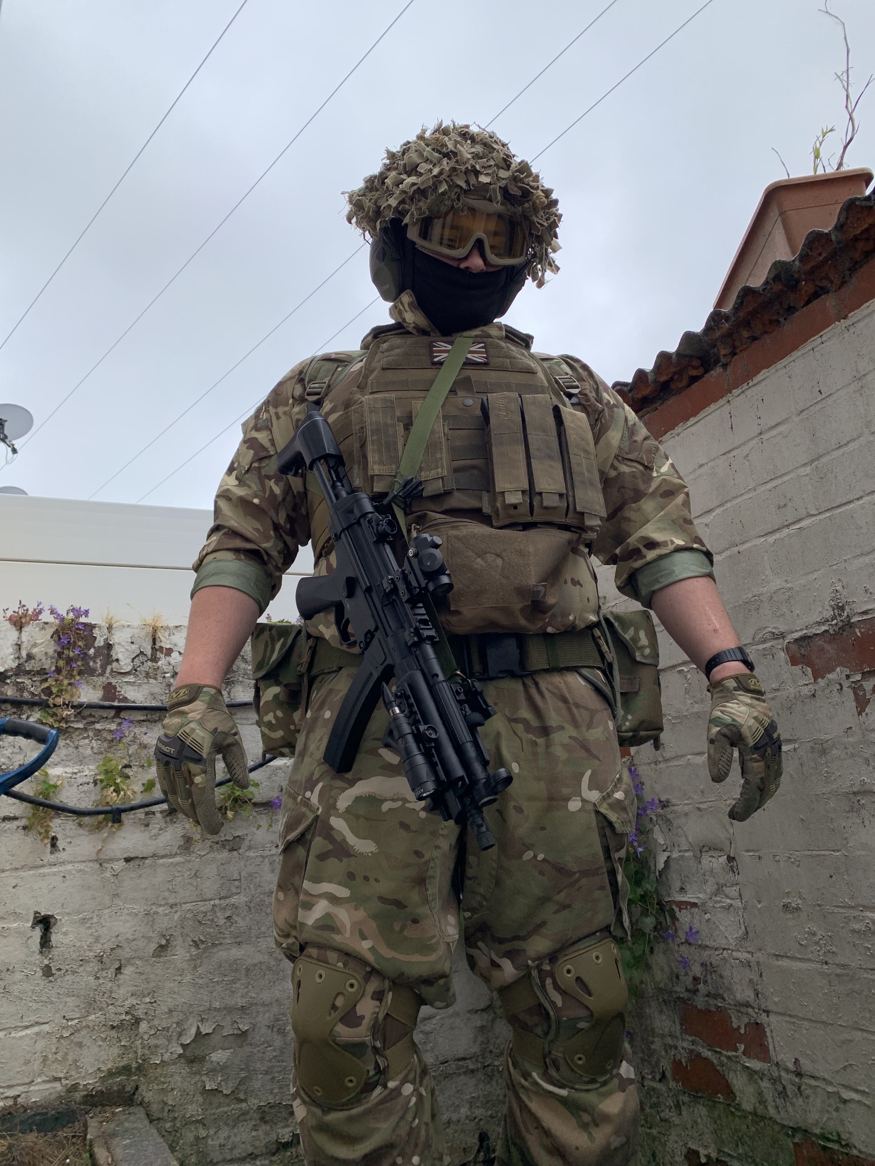 Bargain-bin S95 DPM + cheap hat and gloves off Wish + used/boneyard Viper skeleton harness. ESS goggles, Tigris mesh mask. Kombat UK universal holster. A couple of SA80 pouches, and a cheapo fast mag holder for when I'm in a hurry