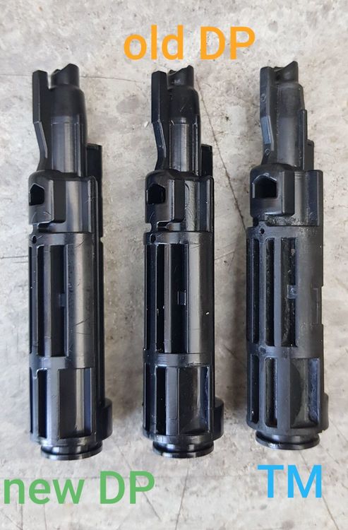 Stand them up vertically and see if the new DP nozzle protrudes a tad more. To me it seems the head of the nozzle seems a tad longer than the Marui one. But it may well be the way the pic is taken.
