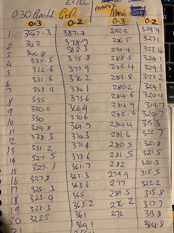 Guys, I did some FPS testing way back in January using a G&P BCG and a Marui BCG. For those who want to know what power you get from using Abbey Ultra Predator gas (the one that comes in a red can) see the attached pic. I did some testing using 0.3 Geoffs and 0.2 Excels at a temperature of 20c (I do believe). The left side shows a G&P bolt carrier group. On the right is the standard Marui bolt. The max figure for the G&P bolt was 387fps!! With the Marui bolt it was 329fps on 0.2s. Interesting results eh? The mag was filled up each time fresh of course which explains the initial high power. The main reason for the G&P bolt having a higher output is the floating valve in the nozzle. Obviously it's set to allow more gas to get pumped into the valve. Yes I can remedy this with a G&P NPAS which I do have but just haven't got round to installing it.... I will do at some point and then report back... (but don't hold me to that lol)