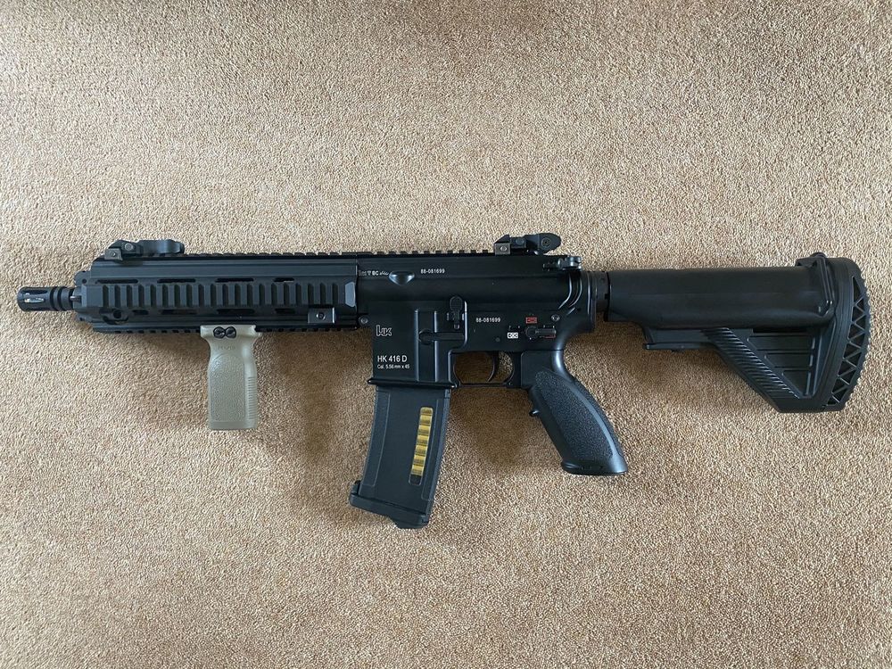 Well I got my mitts on this little beauty a few days ago.. Just wanted a CQB version of my 417! I added a tan Delta stock and the Magpul RVG just to see what the colour contrast looks like.. Think I'll just stick to all black furniture as I'm not sure about mixing up tan and black together.... The sights are Troy... -