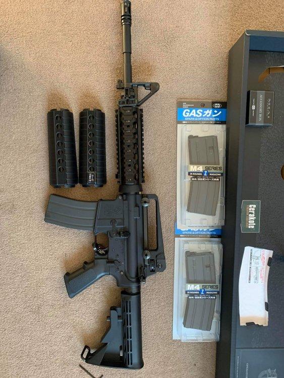 Literally only had the gun a few hours and already made some external changes. Originally the TM M4A1 CARBINE. With an mws handguard, Daniels defence stock, PEQ, acog 3x sight and viper tan sling