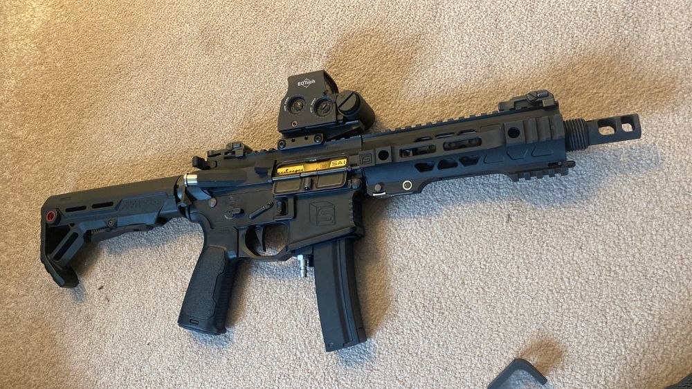 Slapped a Unity riser and a GHK FCG in this G&P SAI. Kicks like a mule Also tested out the new Samoon GHK Alu feedlips on my Airtac adaptor, fit perfectly and should be nigh on indestructible for full auto noisiness