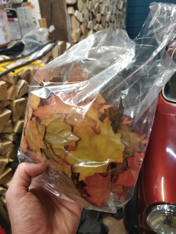 I added some acrylic ink and water into a food back at a ratio of 3:1 in favour of ink and threw in 20 or so leaves at a time. Got a really good coverage. I ran them through the washing machine and tumble dryer inside a pillow case to soften then up first! I roughly followed this guide https://www.google.com/amp/s/stipsniper.com/2017/10/29/crafting-leaves/amp/ Mine turned out pretty well!! That's them bagged up after. -